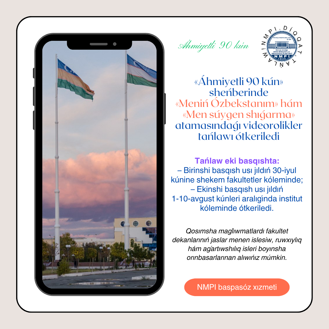 Ájiniyaz atındaǵı Nókis mámleketlik pedagogikalıq institutında student-jaslardıń jazǵı demalıs waqıtların mazmunlı ótkeriw maqsetinde «Áhmiyetli 90 kún» ilajları sheńberinde «Meniń Ózbekstanım» hám «Men súygen shıǵarma» atamasındaǵı videorolikler tańlawı shólkemlestirilmekte.