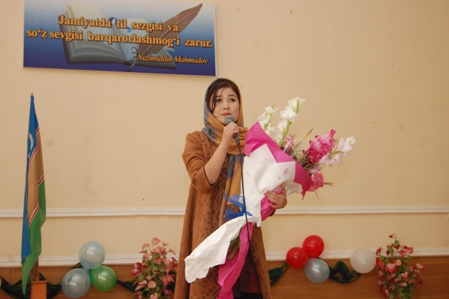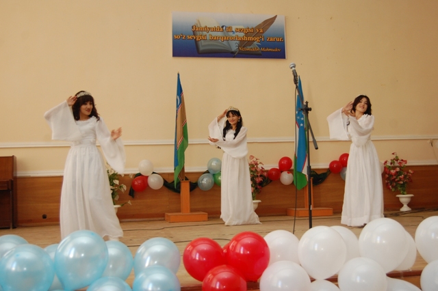Илаж институттың филология факультети қәбилетли студентлериниң атқарыўындағы ана Ўатан ҳәм ана тилин ҳүрметлеў, жаслар турмысындағы тил менен байланыслы айрым турмыслық көринислер сәўлеленген сахналық көринислер, қосықларды көркемлеп оқыў шығыўлары ҳәм концерт бағдарламасы менен даўам етти.