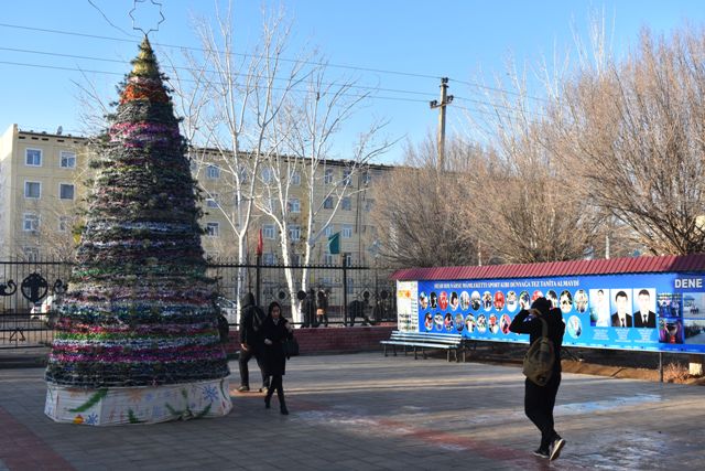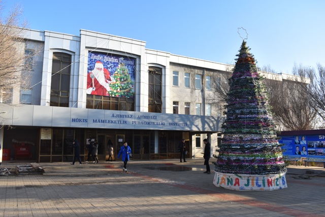 Солар қатары бизиң институтымыздың жаңа жыл бас аршасы да шет тиллери ҳәм дене мәденияты факультетлери имараты алдында бой тикледи.