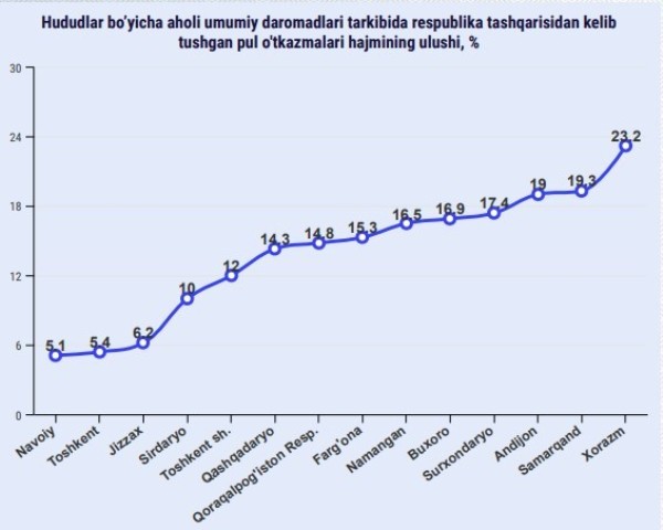 Сырт еллерден пул өткермелериниң тийкарғы бөлими Хорезм (23,2%), Самарқанд (19,3%) ҳәм Әндижан (19%) ўәлаятларының үлесине туўра келген.