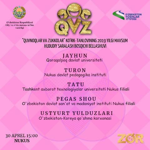 Өзбекстан Республикасы Жоқары ҳәм орта арнаўлы билимлендириў министрлиги ҳәм Өзбекстан жаслар аўқамы «Зўр ТВ» каналы менен биргеликте ҳәр жылы жоқары оқыў орынлары студентлери арасында «Қуўнақлар ҳәм зийреклер» таңлаўын өткерип келмекте.