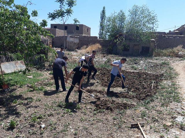 Студентлер Айтмурат ағаның үй әтирапында абаданластырыў ҳәм көгалландырыў жумысларын қызғын пәтлерде алып барды – жабайы шөплерди шаўып, атызларын аўдарды ҳәм жүзимлерин қайтадан беккемлеп байлап шықты.