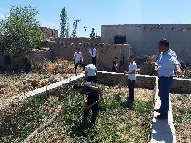 Студентлер Айтмурат ағаның үй әтирапында абаданластырыў ҳәм көгалландырыў жумысларын қызғын пәтлерде алып барды – жабайы шөплерди шаўып, атызларын аўдарды ҳәм жүзимлерин қайтадан беккемлеп байлап шықты.