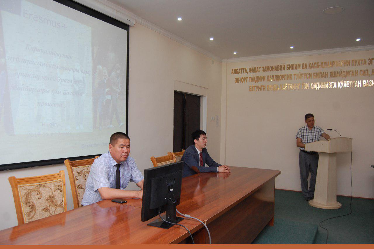 Күн тәртибиндеги белгиленген темалар бойынша презентациялар исленди. Дәслеп Эразмус+ бағдарламасы шеңбериндеги жоқары билимлендириўдиң имканиятларын кеңейтиў бойынша исленип атырған Қарақалпақстандағы жойбарлар ҳаққында, жойбарлар тарялаў усыллары, кредит мобильлик ҳаққында жыйналғанларға Эразмус+ миллий экспертлер топарының ағзасы Бахытбай Палўанов кең түрде мағлыўматлар берди. Ол «Қарақалпақстандағы Эразмус+ жойбарлары» деген темада баянат жасады.