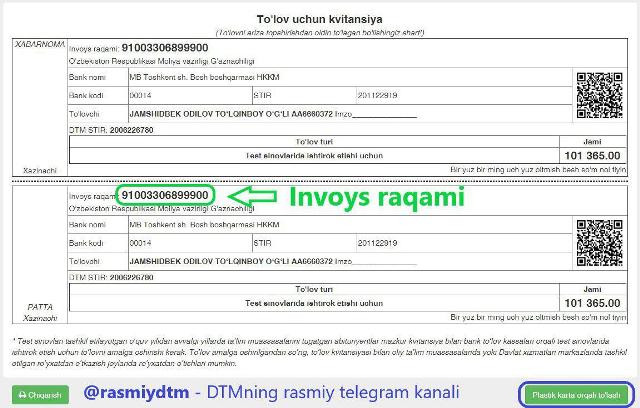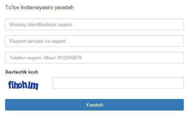 А) Биометриялық паспортқа ийе болған абитуриентлер Мәмлекетлик тест орайының pay.dtm.uz сайты арқалы өзине төлем квитанциясын жаратып, шығарып алыўы мүмкин. Буның ушын жеке идентификациялық номери, паспорт сериясы ҳәм номери және телефон номерин киргизип, «Яратиш» түймеси басылады.
