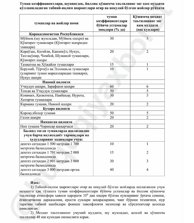 Ҳүжжет тийкарында «Районлық коэффициентлерди, сондай-ақ, оларға ҳәр жылы берилетуғын қосымша дем алыстың ең кем мүддети қолланылатуғын тәбийғый-климатлық шараятлары аўыр және қолайсыз болған орынлардың дизими» тастыйықланды.