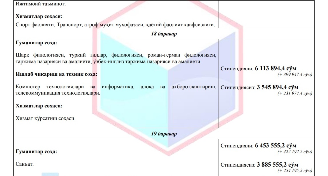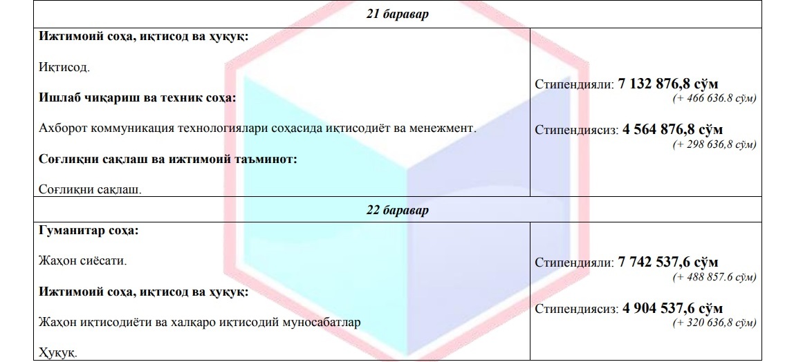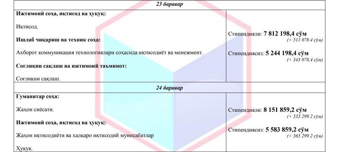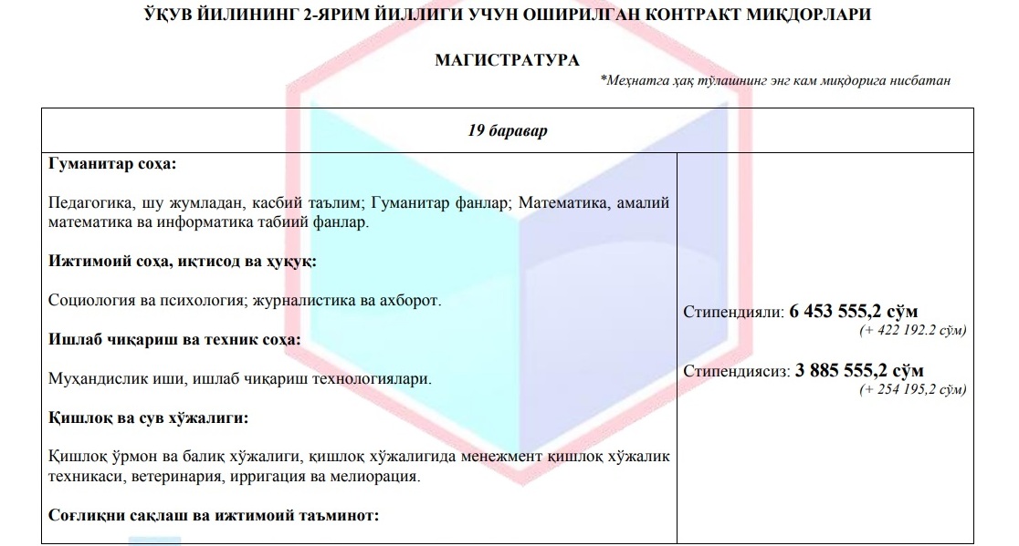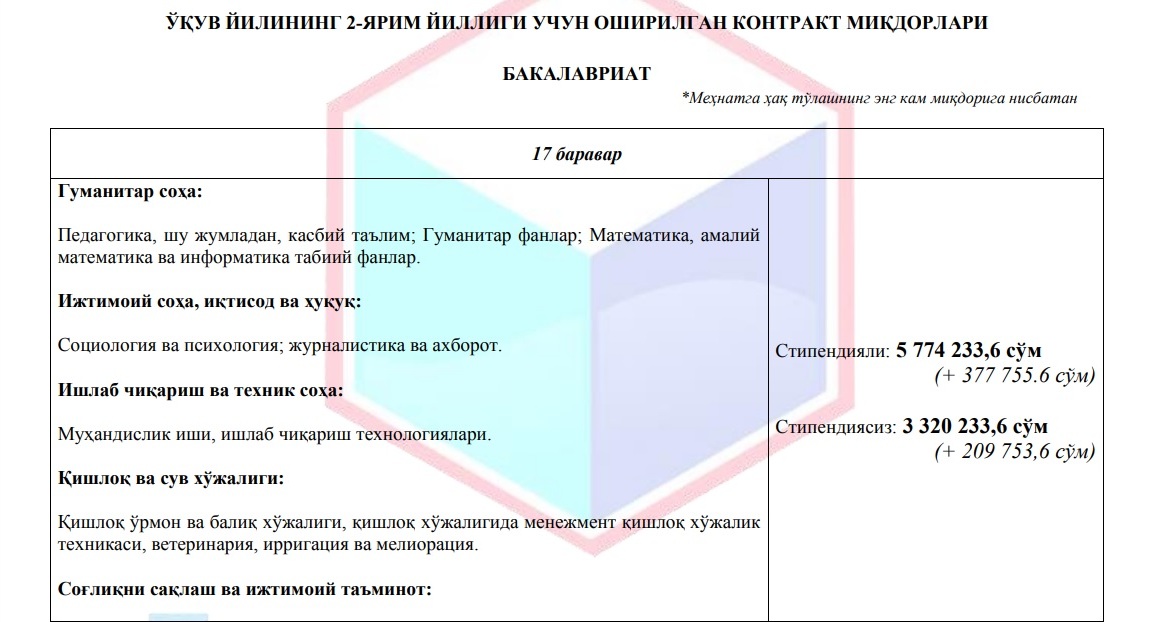 Хабарыңыз бар, Жоқары ҳәм орта арнаўлы билимлендириў министрлиги тәрепинен жоқары оқыў орынларындағы төлемли контракт муғдарлары мийнетке ҳақы төлеўдиң ең кем муғдарына байланыстырып қойылған.