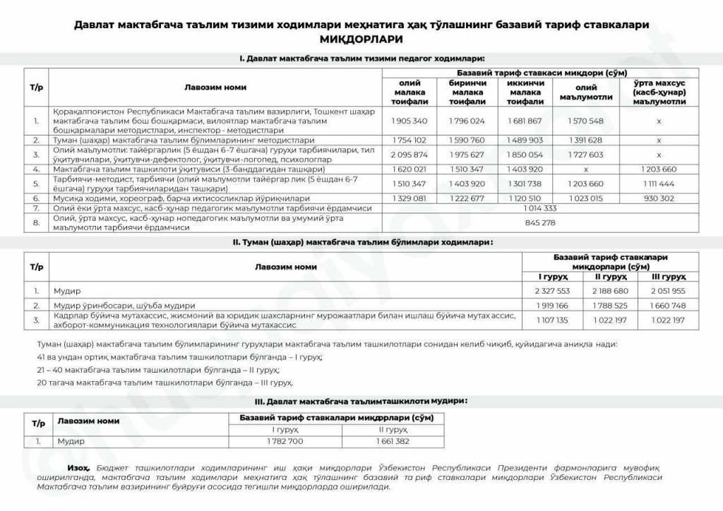 Қарар тийкарында киргизилген өзгерислерге муўапық, мәмлекетлик мектепке шекемги билимлендириў системасының хызметкерлери мийнетине ҳақы төлеўдиң базалық тариф ставкалары муғдарлары өзгерди.