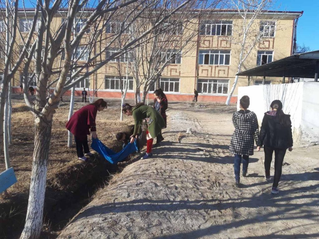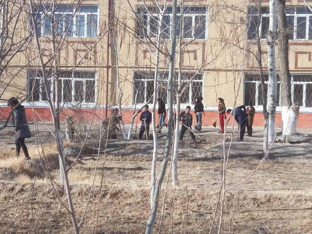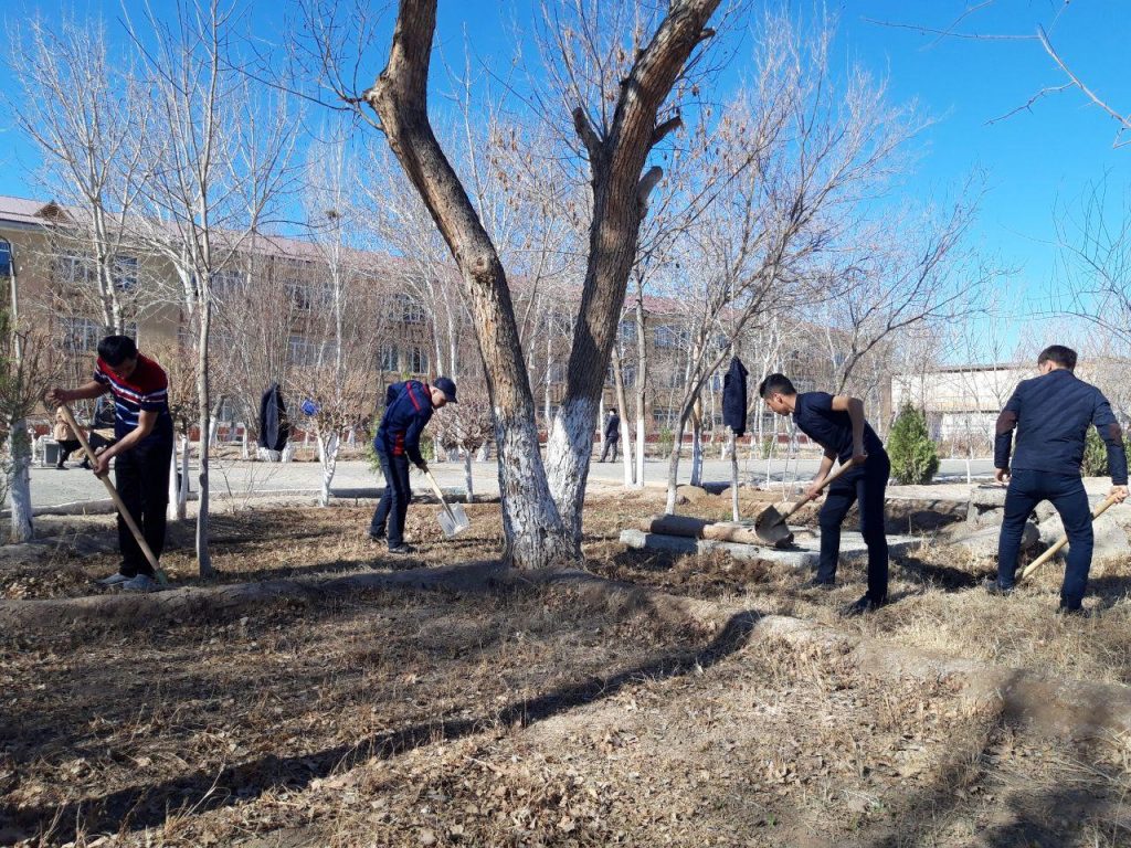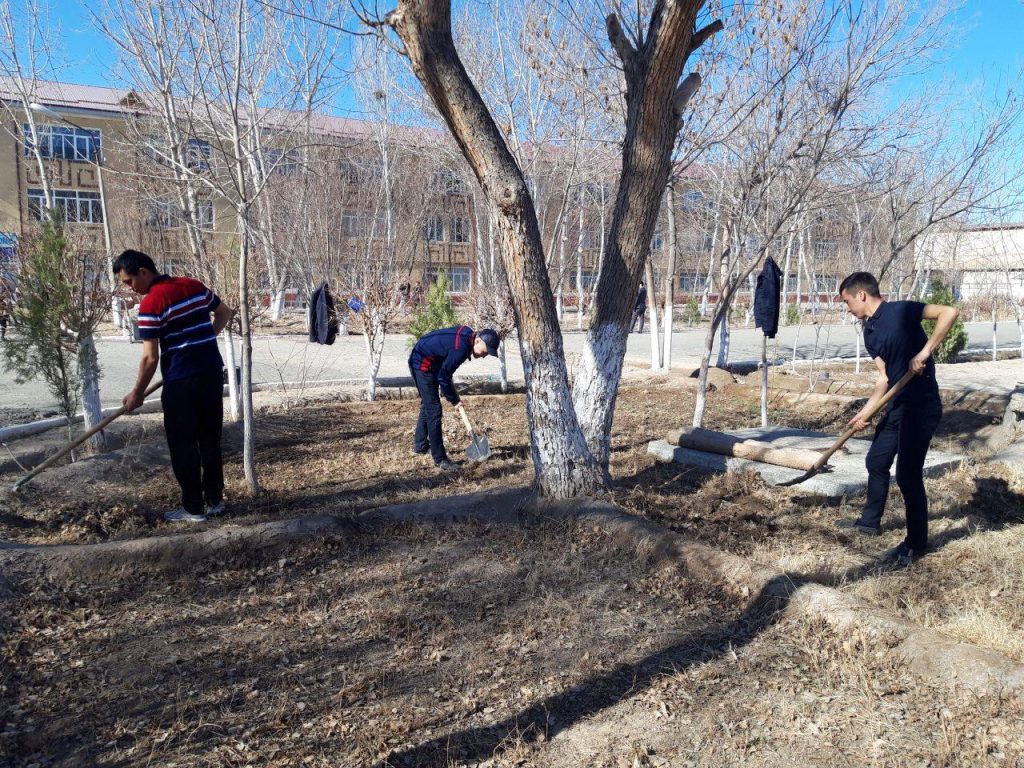 Бүгин, 14-март күни азанғы ўақыттан баслап сүўретлеў өнери ҳәм мийнет тәлими, физика-математика факультетлери өз аймақларында терек ҳәм гүл нәллерин егип, бағ ҳәм гүлзарлар жаратыў, оларға суў қуйыў, қоршаған орталықты, сондай-ақ, оқыў аудиторияларын ҳәр қыйлы шығындылардан тазалап, тереклер және жол шетлериндеги тосықлар, дийўалларды ҳәклеў жумысларын аўызбиршиликли түрде алып бармақта.