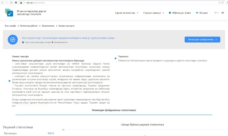 Мәмлекетлик хызметлер орайының мәлим етиўинше, автотранспорт қуралларының ҳәрекетлениўине арнаўлы рухсатнаманы Интернет арқалы алыў ушын Бирден-бир интерактив мәмлекетлик хызметлер порталынан пайдаланыў мүмкин.