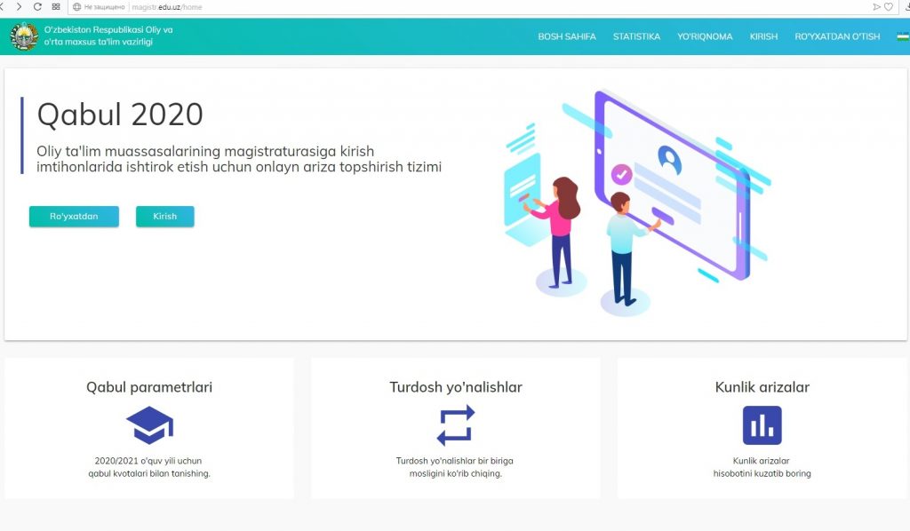 Алдын хабар берилгениндей, быйылғы жылы мәмлекетлик жоқары оқыў орынларының магистратура қәнигеликлерине ҳүжжетлерди тапсырыў процеси Жоқары ҳәм орта арнаўлы билимлендириў министрлигиниң рәсмий веб-сайты – magistr.edu.uz арқалы әмелге асырылады.