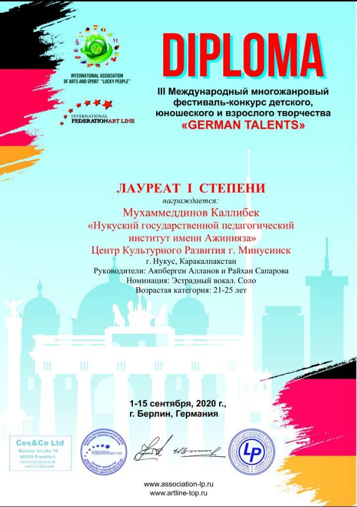 Әжинияз атындағы Нөкис мәмлекетлик педагогикалық институтының педагогика факультети музыкалық тәлим бағдарының студенти Қаллибек Муҳаммеддинов Германия мәмлекетиниң пайтахты Берлин қаласында 1-15-сентябрь күнлери болып өткен III Халықаралық көп жанрлы «GERMAN TALENTS» атлы онлайн конкурсына қатнасқан еди.