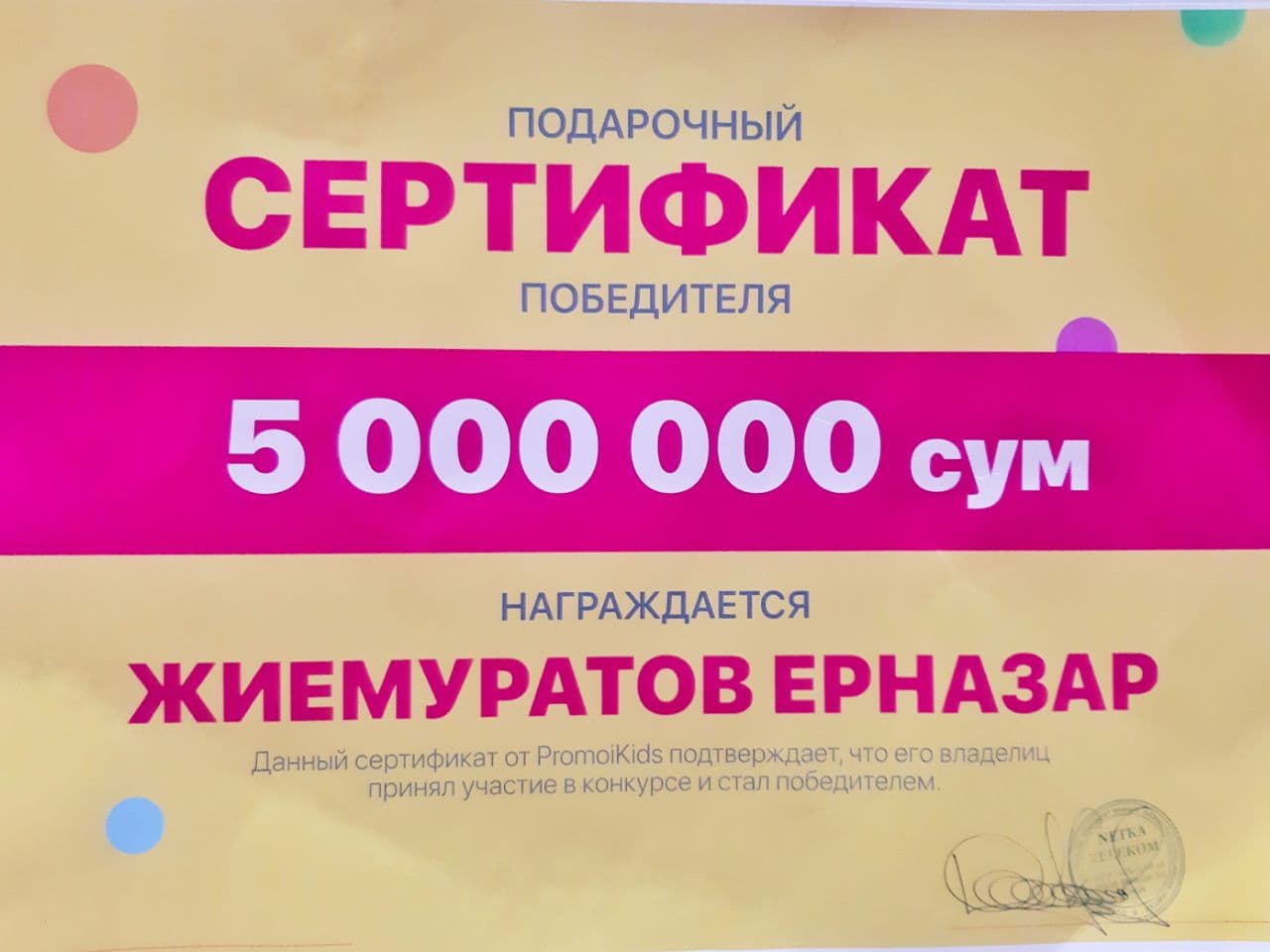 Finalda onıń balalar ushın rus tili álipbesin úyretiwge arnalǵan videoroligi múnásip bahalanıp, 5 000 000 sum muǵdarındaǵı sıylıq jeńimpazı boldı hám arnawlı sertifikatqa iye boldı.