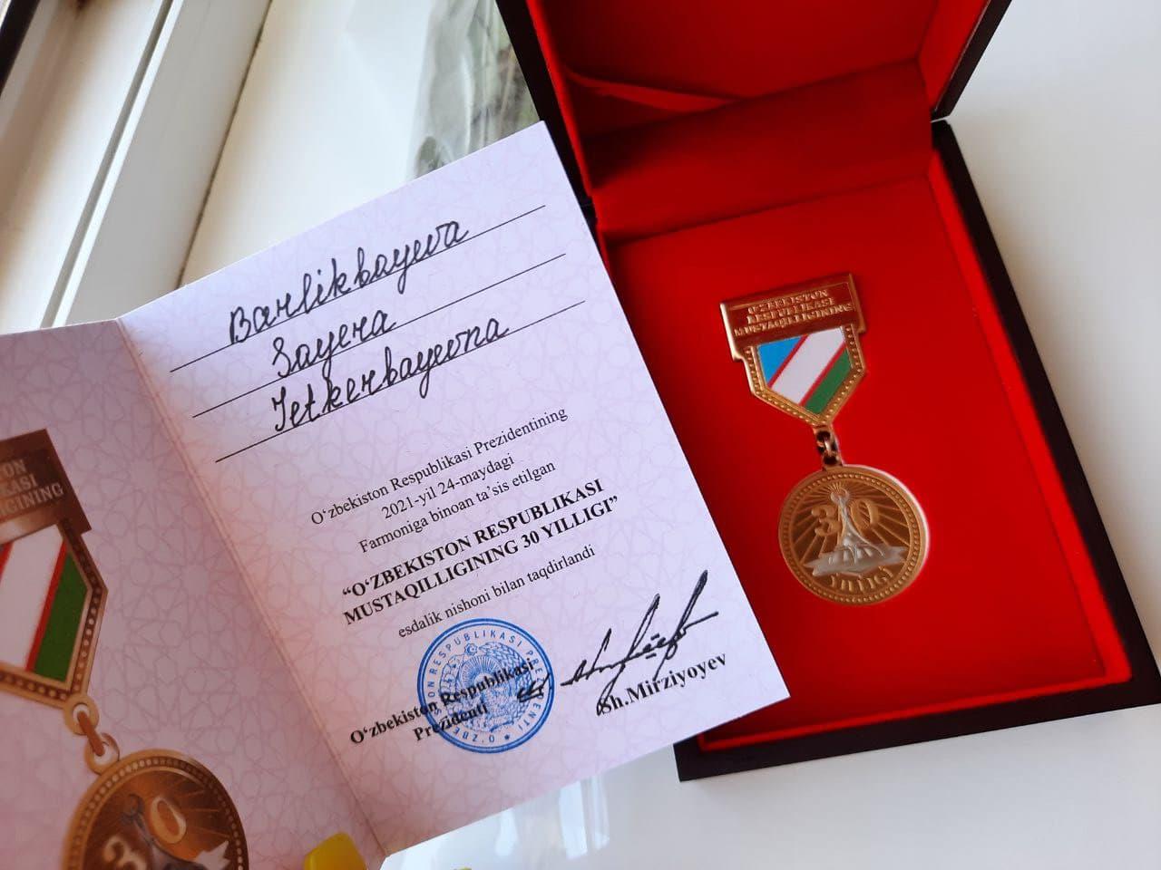 Ózbekstan Respublikası Ǵárezsizliginiń 30 jıllıǵı múnásibeti menen elimizdiń jámiyetlik-siyasiy, sociallıq-ekonomikalıq turmısında belsendilik kórsetip kiyatırǵan bir topar pidayı insanlar Ózbekstan Respublikası Prezidentiniń pármanı tiykarında shólkemlestirilgen «Ózbekstan Respublikası Ǵárezsizliginiń 30 jıllıǵı» estelik belgisi menen sıylıqlandı.