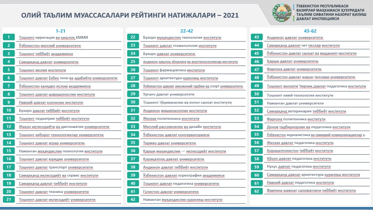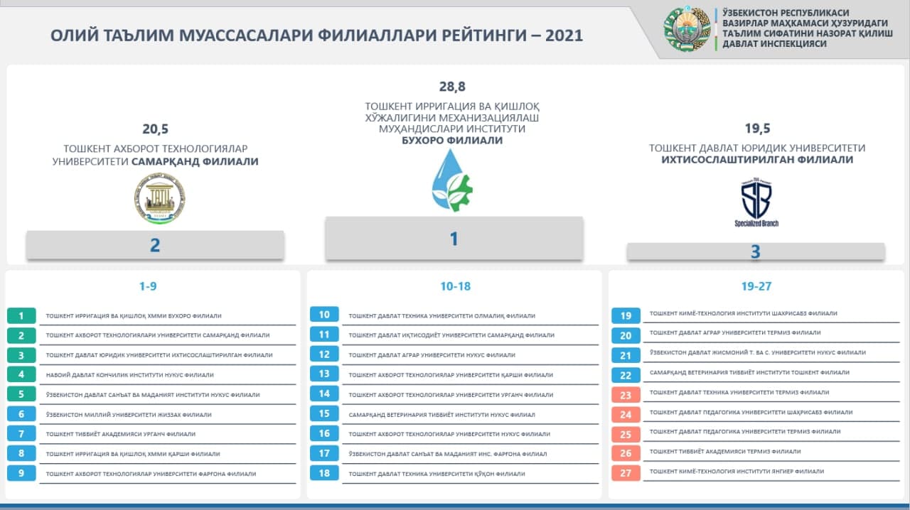 Bilimlendiriw sapasın qadaǵalaw boyınsha mámleketlik inspekciyası tárepinen Ózbekstanda jumıs alıp barıp atırǵan joqarı oqıw orınları hám filiallarınıń 2020-jıldaǵı milliy reytingi járiyalandı.