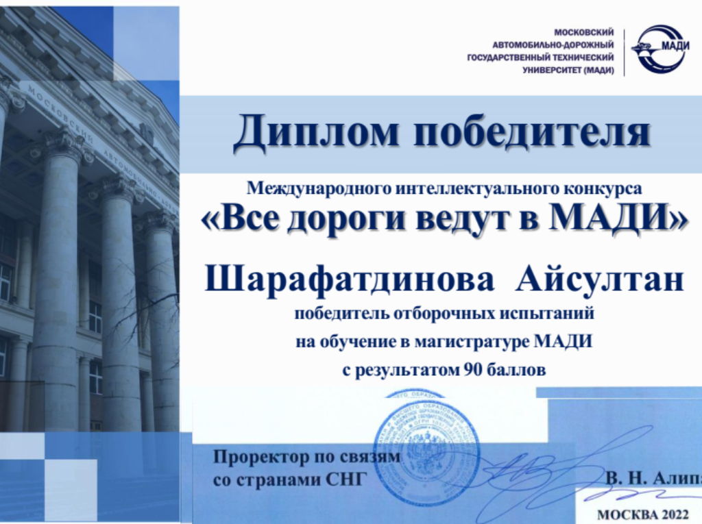 Ájiniyaz atındaǵı Nókis mámleketlik pedagogikalıq institutı pedagogika hám psixologiya bakalavr tálim baǵdarınıń 4-kurs studenti Aysultan Sharafatdinova 2022-jıl yanvar-fevral aylarında ótkerilgen «Все дороги ведут в МАДИ» atamasındaǵı xalıqaralıq intellektual tańlawınıń juwmaqları boyınsha jeńimpaz dep tabılıp, Moskva avtomobil jolları mámleketlik texnikalıq universitetiniń 38.04.03 «Qánigelerdi basqarıw» qánigeligi boyınsha magistratura basqıshına oqıwǵa waqtınan burın qabıl etildi. Oqıw qárejetleri Rossiya Federaciyası federal byudjetinen qaplanıwı málim etildi.