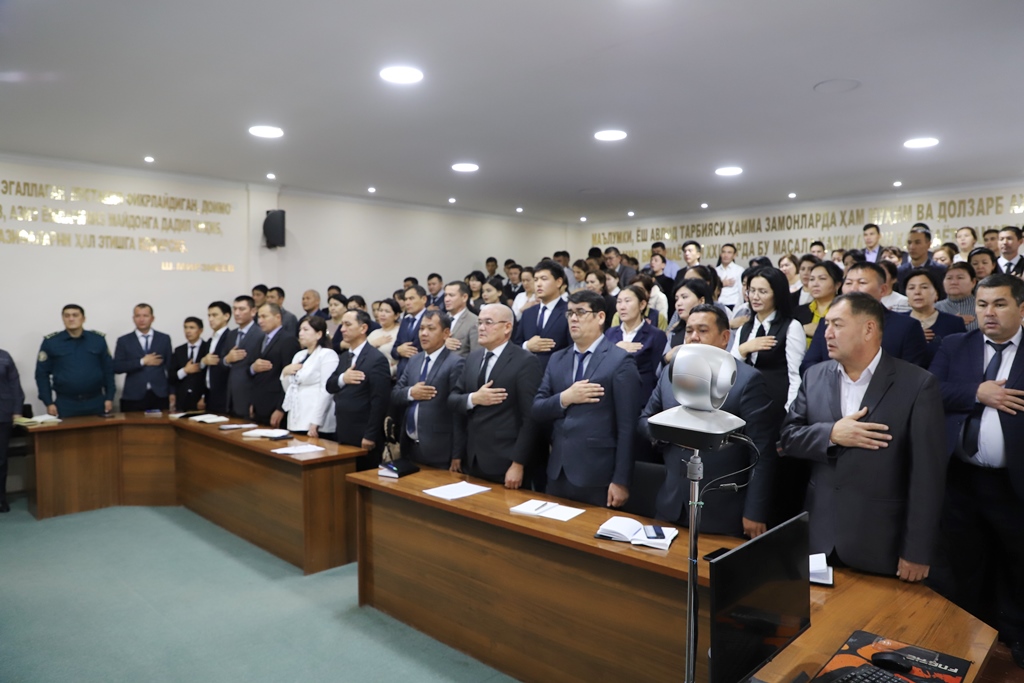 Mámleketlik gimnler menen baslanǵan saltanatlı ilajǵa Jaslar isleri agentligi Qaraqalpaqstan Respublikası basqarmasınıń qánigeleri, fakultet dekanlarınıń orınbasarları, professor-oqıtıwshılar, tyutorlar hám belsendi studentler qatnastı.