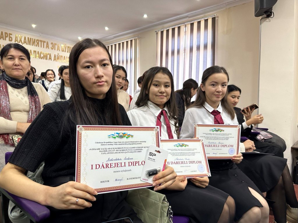 Sonday-aq, ilaj sheńberinde videorolikler, plakatlar hám esseler Tańlawına belsendi qatnasıp, joqarı nátiyjelerdi kórsetken 100 ge jaqın student-jaslar institut rektorı hám birinshi prorektorınıń I, II, III dárejeli diplomları menen, jáne de korrupciyaǵa qarsı gúresiwde belsendilik kórsetken Shet tilleri, Fizika-matematika, Baslawısh tálim, Tariyx, Dene mádeniyatı, Súwretlew óneri hám texnologiyalıq tálim hám Ellikqala pedagogika fakultetleri dekan orınbasarları hám tyutorları rektor hám birinshi prorektordıń húrmet jarlıqları menen sıylıqlandı.
