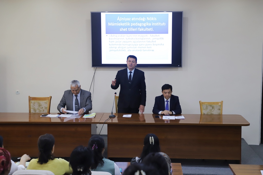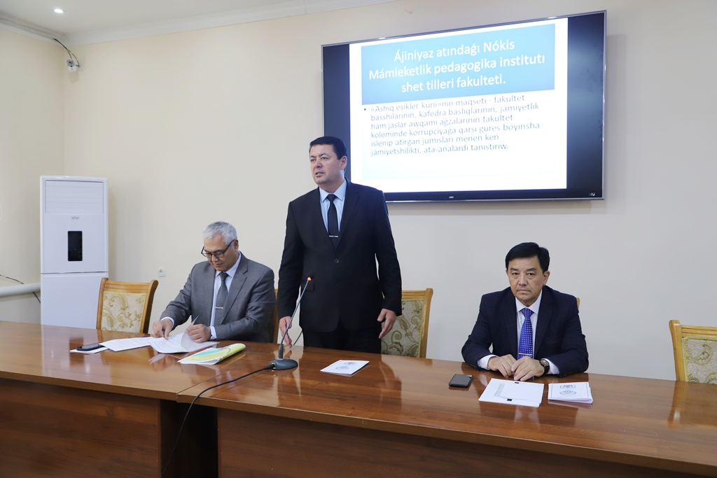 Búgin, 4-may kúni Ájiniyaz atındaǵı Nókis mámleketlik pedagogikalıq institutı Shet tilleri fakultetinde jámiyette sociallıq salamat ortalıqtı bekkemlew hám korrupciyaǵa qarsı gúresiw boyınsha ámelge asırılıp atırǵan jumıslardı ata-analar menen birgelikte dodalaw maqsetinde ashıq esikler kúni shólkemlestirildi.