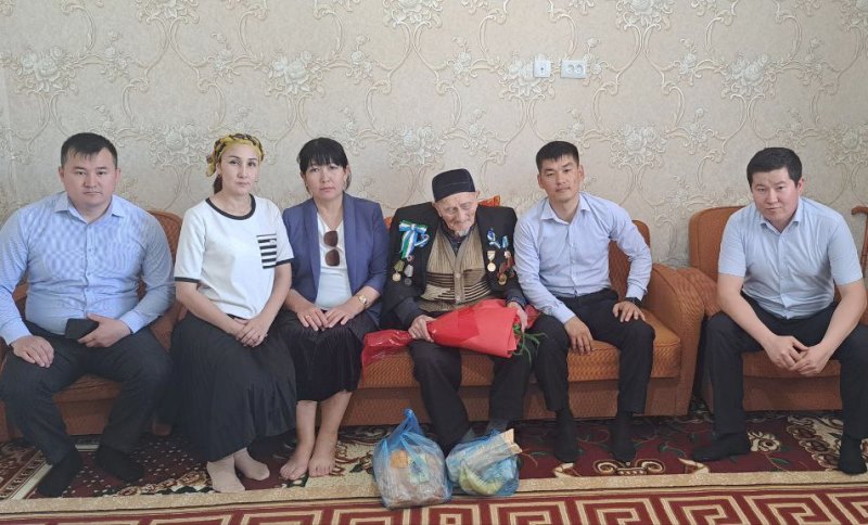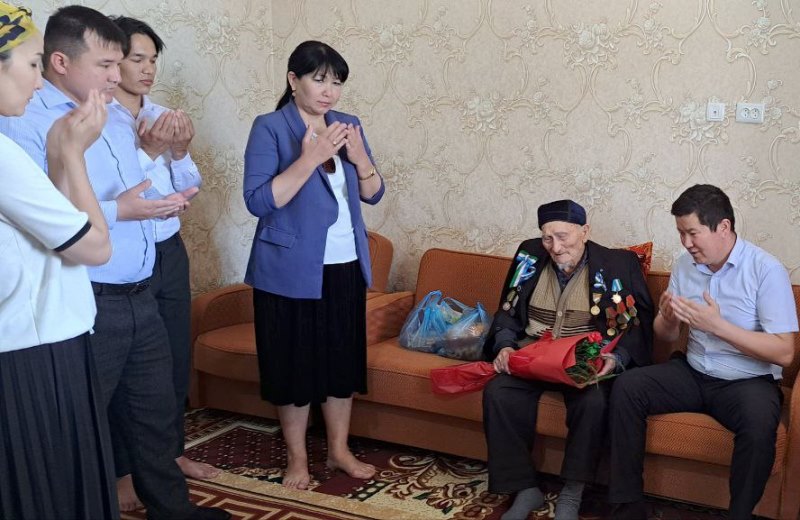 Bayram múnásibeti menen alıp kelgen sawǵaların tapsırıp, Qádirbay ataǵa uzaq ómir tiledi.