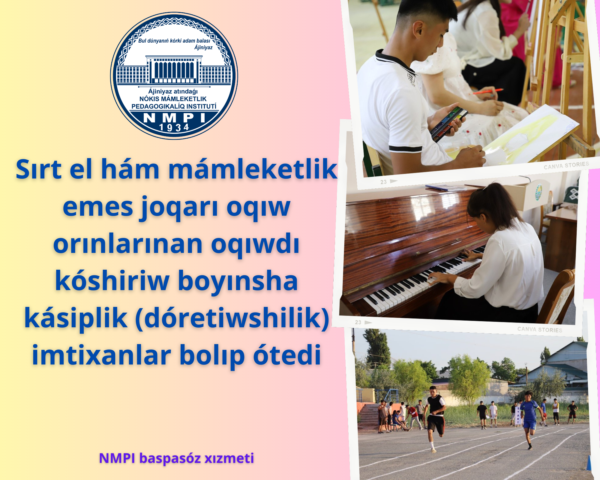 🗓Usı jıldıń 14-avgust kúni 2023-2024-oqıw jılı ushın sırt el hám mámleketlik emes joqarı oqıw orınlarınan Ájiniyaz atındaǵı Nókis mámleketlik pedagogikalıq institutınıń kiriw sınaqları quramında kásiplik (dóretiwshilik) imtixan bolǵan bakalavriat tálim baǵdarlarına oqıwdı kóshiriw boyınsha dizimnen ótken puqaralar ushın kásiplik (dóretiwshilik) imtixanlar bolıp ótedi.