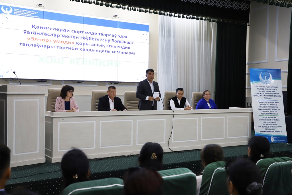 Seminarda Mámleketlik xızmetti rawajlandırıw agentliginiń Qaraqalpaqstan Respublikası filialı direktorınıń orınbasarı A.Reyimbaev, «El-yurt umidi» qorı qarjıları esabınan sırt ellerdegi abıroylı joqarı oqıw orınlarında magistratura baǵdarlamaları arqalı bilim alıp, búgingi kúnde mámleketimizdiń xalıq xojalıǵı tarawlarında jumıs alıp barıp atırǵan stipendiatlar G.Godarova, U.Kamalov, B.Uzaqbaevalar sózge shıǵıp, qor tárepinen jaslarǵa ajıratılıp atırǵan sırt el grantlarınıń áhmiyeti haqqında maǵlıwmatlar berip, qor stipendiyasın jeńip alıw boyınsha óz tájiriybeleri menen bólisti.