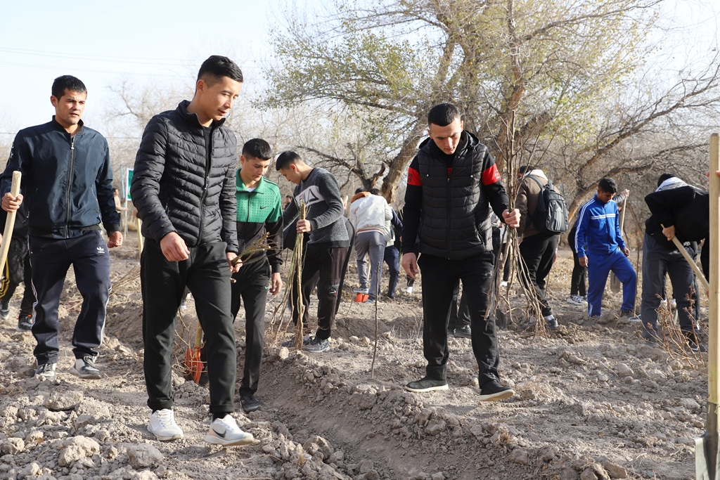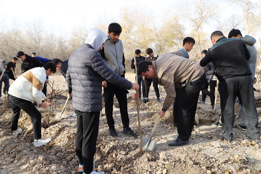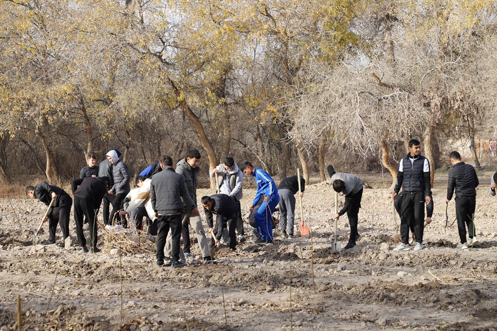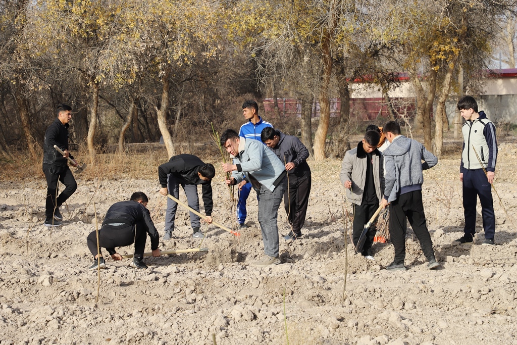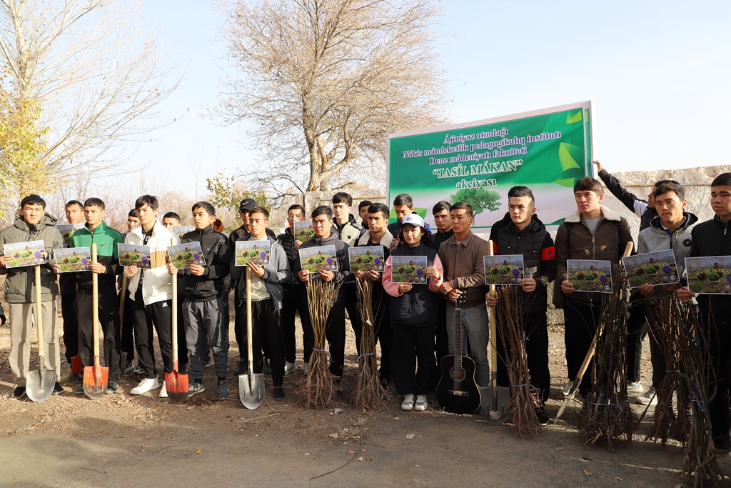 Búgingi kúnge shekem student-jaslar tárepinen fakultet átirapı, sonıń menen birge, qalamızdıń túrli orınlarında bos jatırǵan jerlerge 1 500 den aslam túrli miywe hám dekorativ terek nálleri otırǵızıldı.