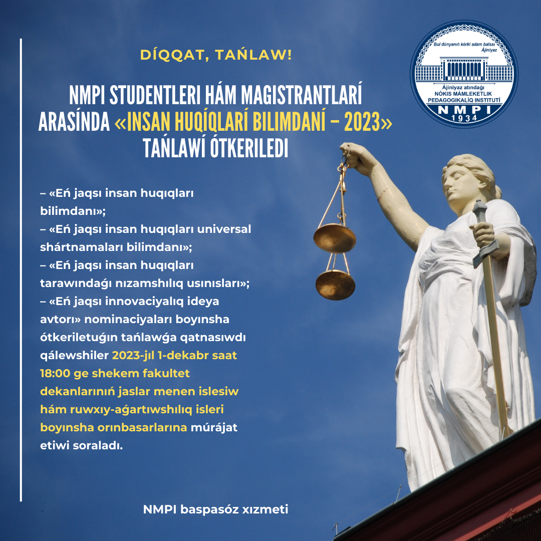 Dıqqat, tańlaw! NMPI studentleri hám magistrantları arasında «Insan huqıqları bilimdanı – 2023» tańlawı ótkeriledi