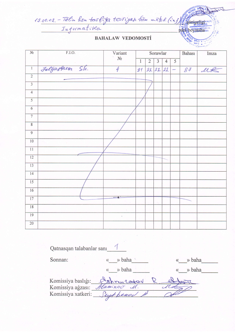 Imtixan nátiyjeleri menen kórsetilgen PDF formattaǵı fayldı júklep alıw arqalı tolıq tanısıwıńız múmkin.