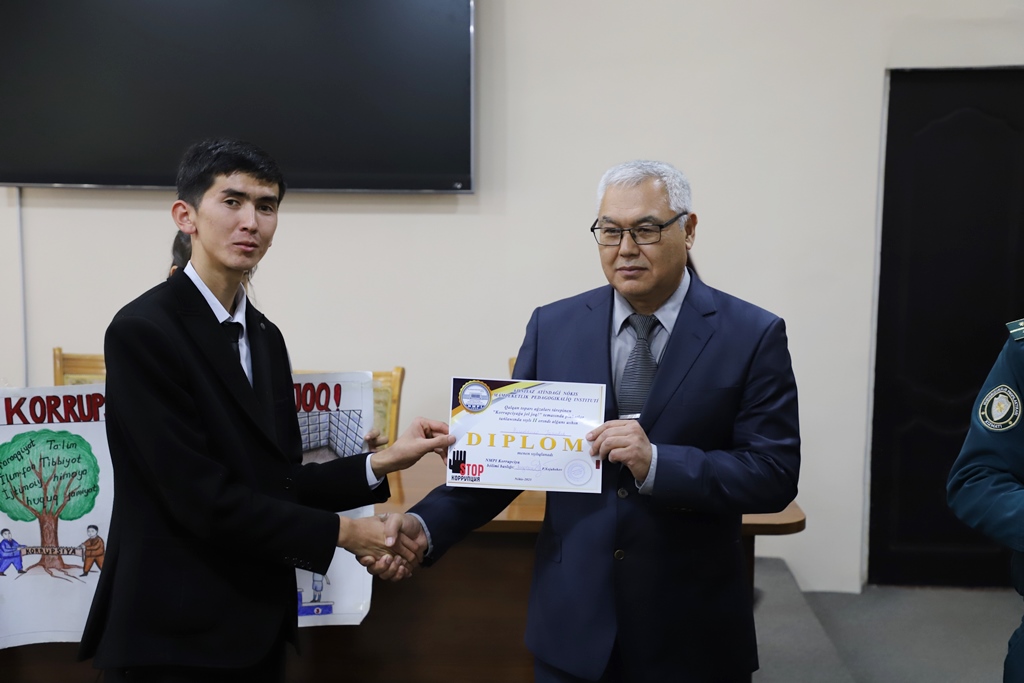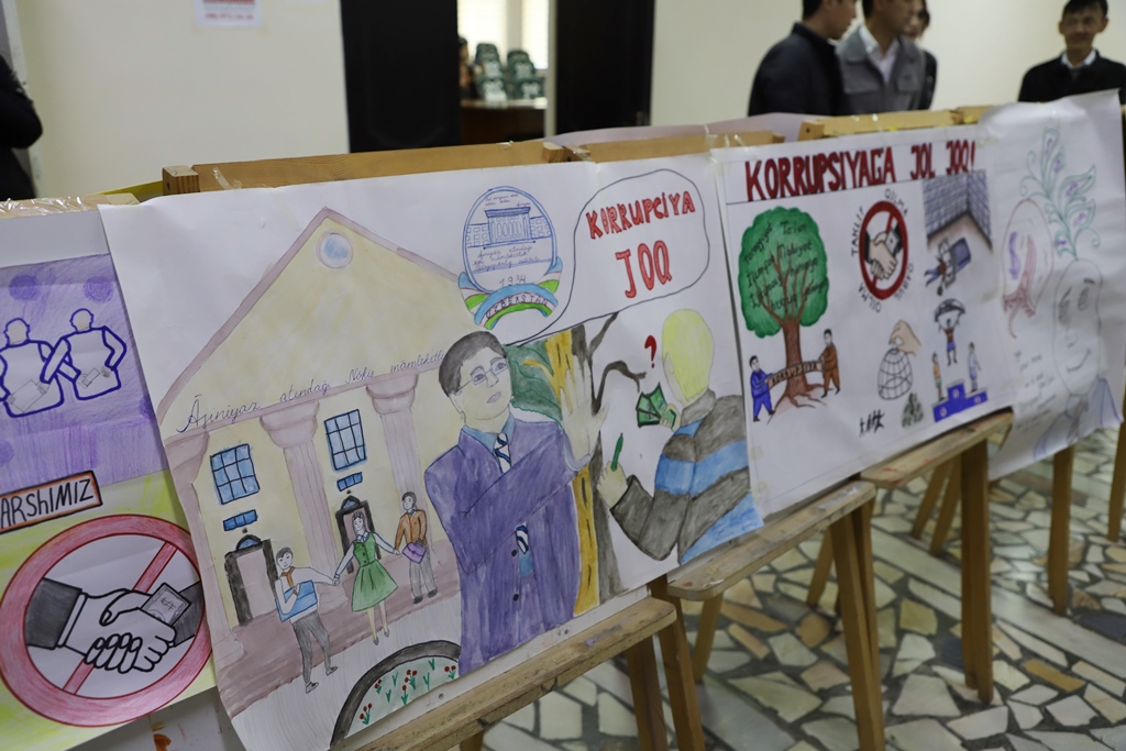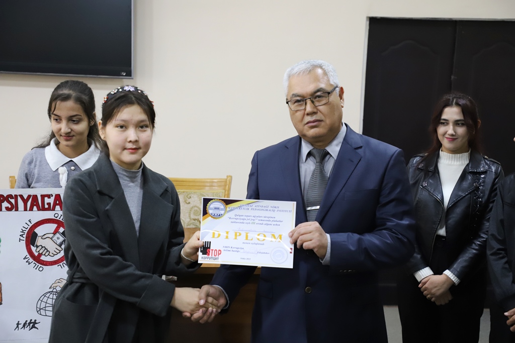 Ájiniyaz atındaǵı Nókis mámleketlik pedagogikalıq institutı «Qalqan» toparı aǵzaları tárepinen 9-dekabr – Xalıqaralıq korrupciyaǵa qarsı gúresiw kúni aldınan fakultetlerde oqıp atırǵan studentler arasında «Korrupciyaǵa orın joq» atamasında plakatlar tańlawı shólkemlestirildi.