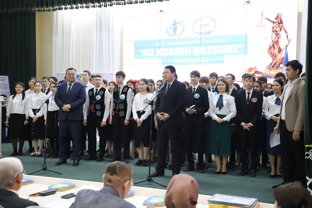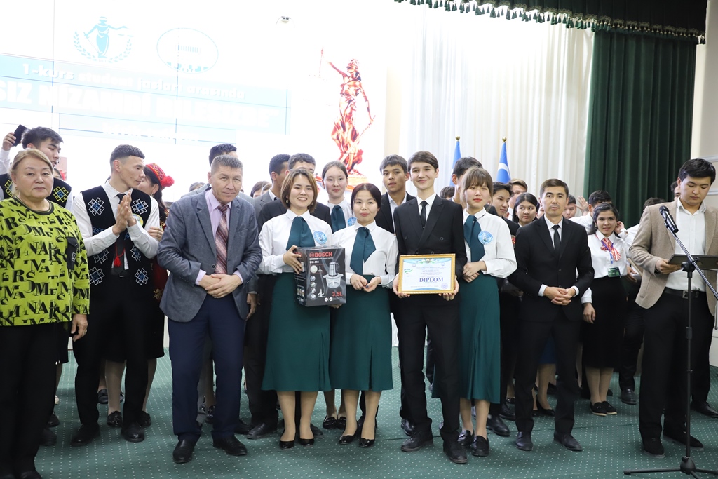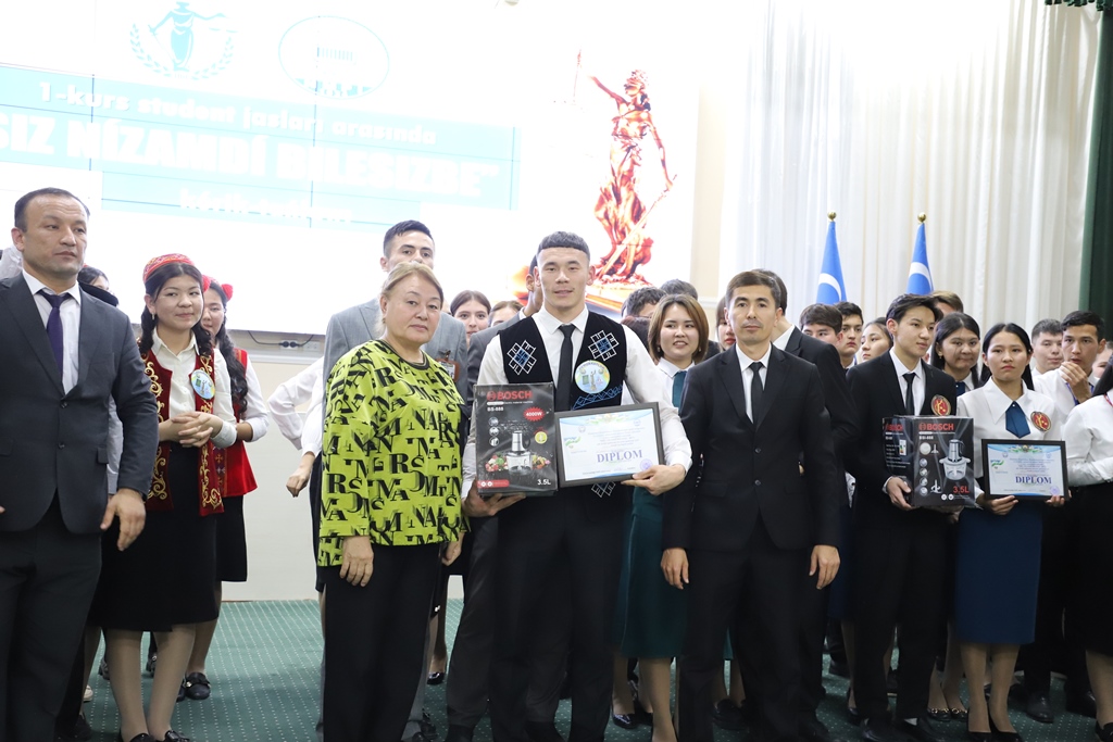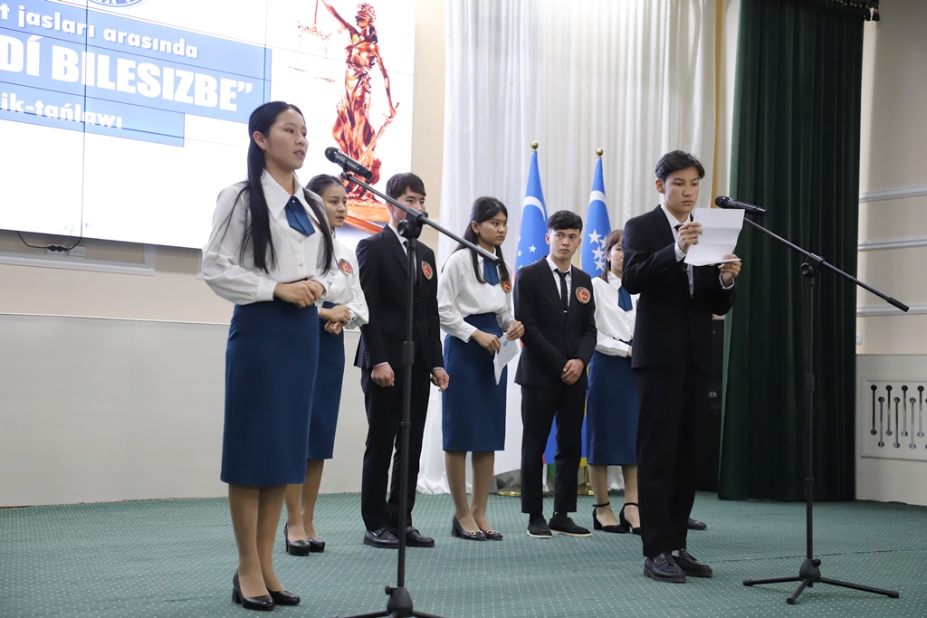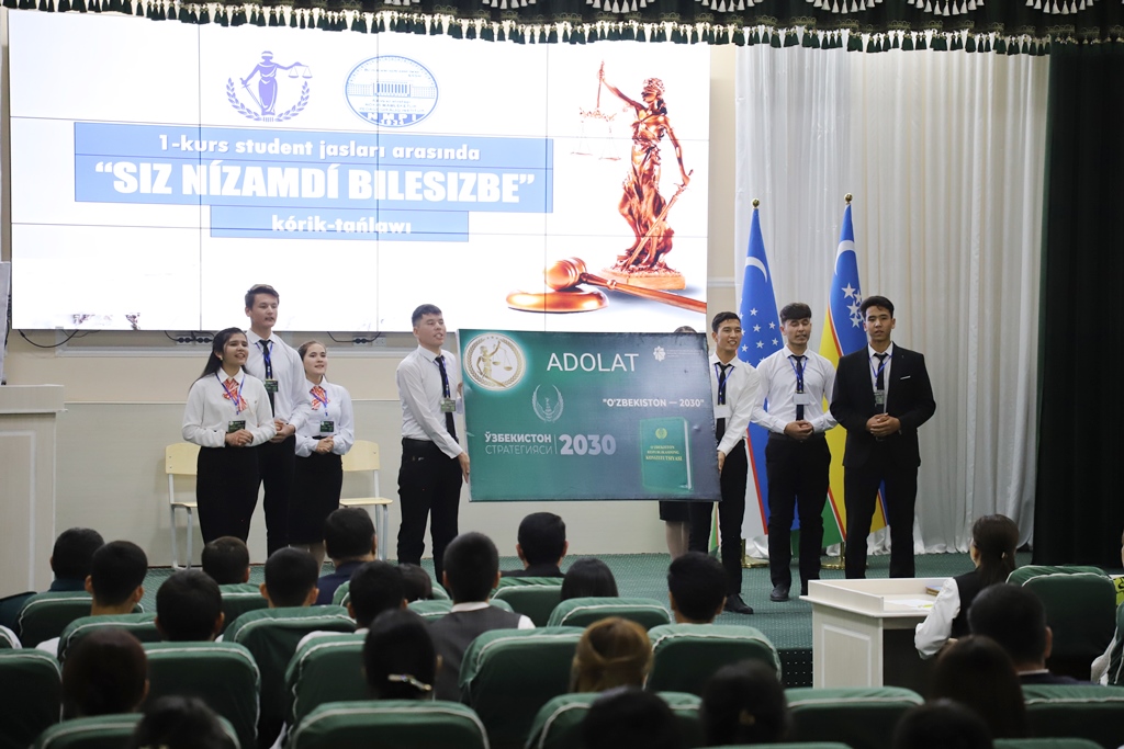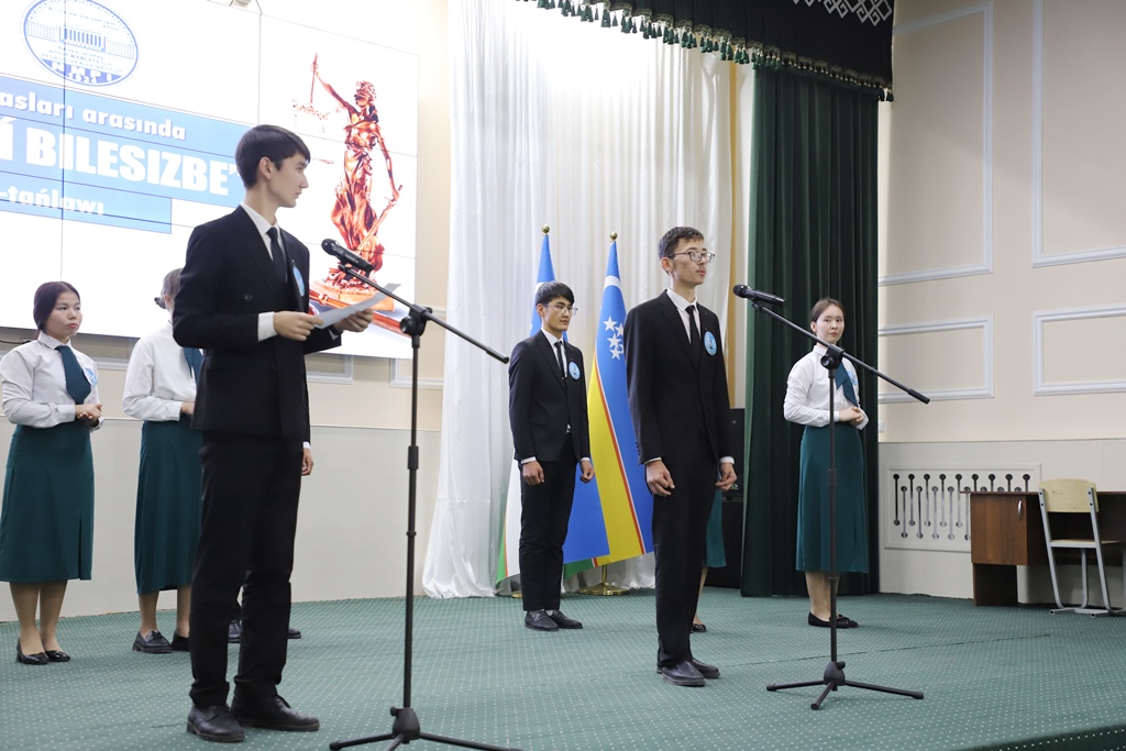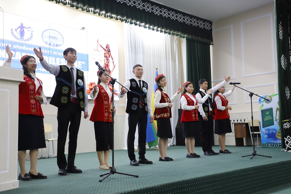 Mámleketimizde ámelge asırılıp atırǵan keń kólemli reformalarda student-jaslardıń belsene qatnasıwın támiyinlew, joqarı mánawiyatlı, huqıqıy jaqtan sawatlı, erkin pikirleytuǵın jaslardı tárbiyalaw, adamzatqa jat bolǵan illetlerge qarsı gúresiw immunitetin qáliplestiriw, bos waqıtların mazmunlı ótkeriw, sonday-aq, jaslardıń jańalanǵan Konstituciya boyınsha bilimlerin bahalaw jáne xoshametlew maqsetinde shólkemlestirilgen tańlawda «Ádalat», «Yusticiya», «Jas demokratlar», «Jańa Ózbekstan jasları», «Demokratlar», «Liberal», «Femida» komandaları sálemnama, soraw-juwap hám saxnalıq kórinis sıyaqlı shártler boyınsha bilimlerin, kónlikpelerin sınaqtan ótkerdi.