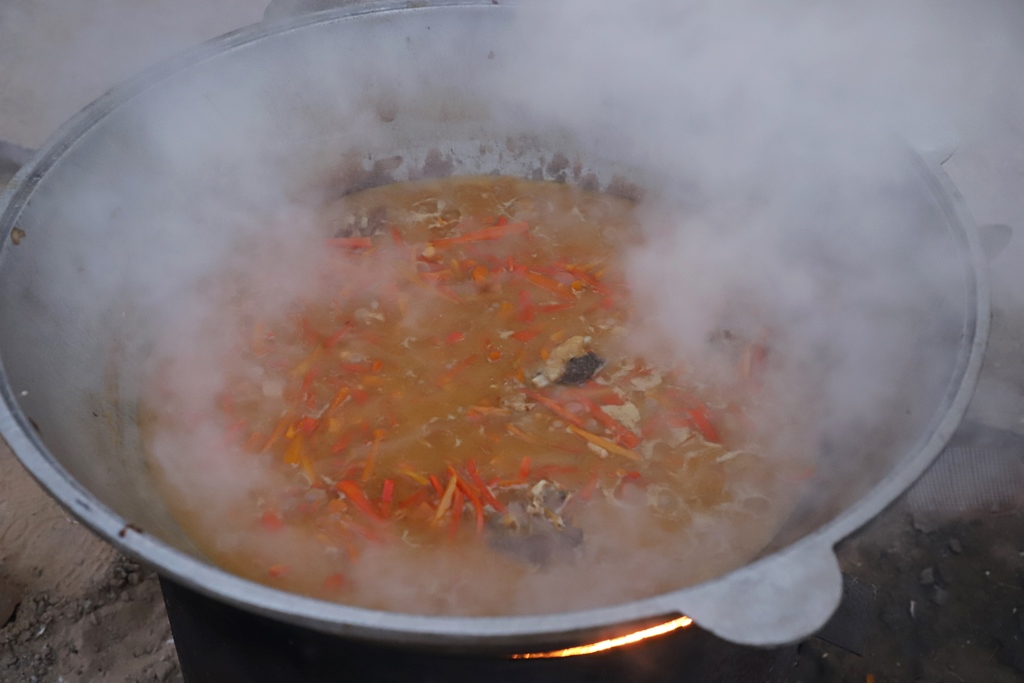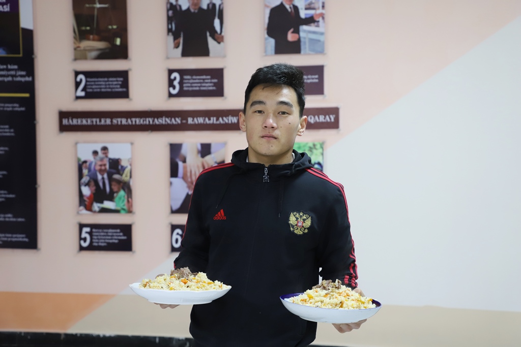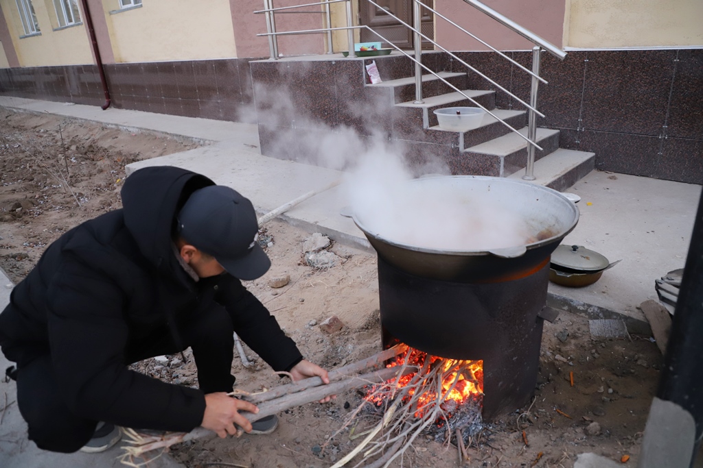 Studentler pedagog-tárbiyashılar basshılıǵında awızbirshilikte oshaqqa ot jaǵıp, qazanda milliy taǵamlarımızdıń biri esaplanǵan palaw pisirdi.