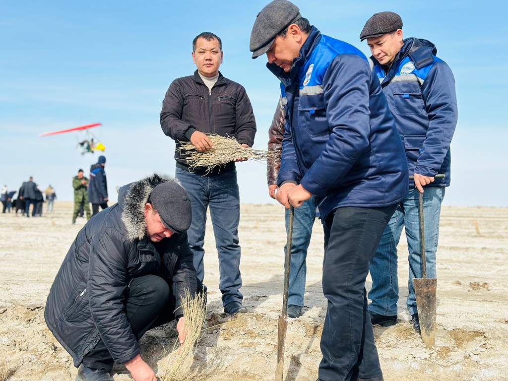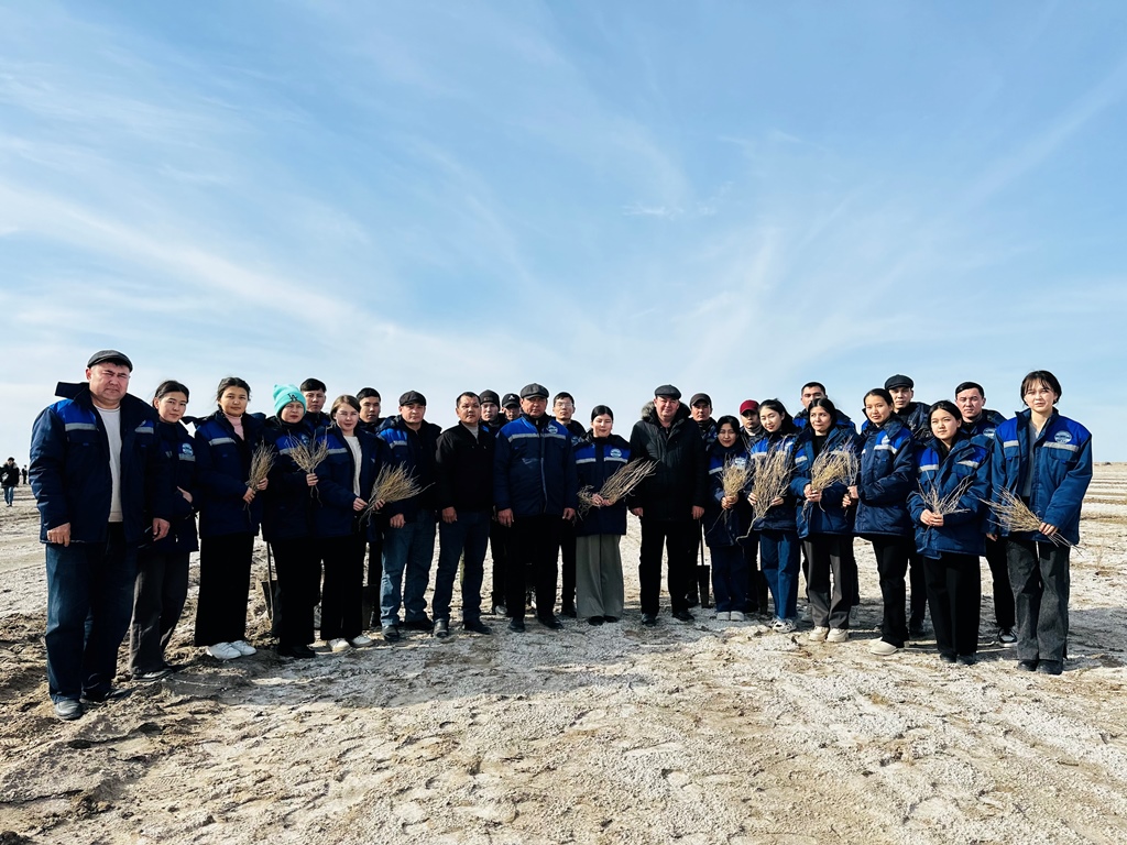 Teńizdiń suwı tartılǵan túbinde seksewil, qandım, qarabaraq, jıńǵıl hám basqa da shólge shıdamlı, átiraptaǵı duzlı qumlardıń hawaǵa kóteriliwiniń aldın alıwǵa xızmet etetuǵın ósimliklerdi egiw jumıslarına Ájiniyaz atındaǵı Nókis mámleketlik pedagogikalıq institutınıń miynet jámááti hám student-jasları da óz úleslerin qosıp kelmekte.