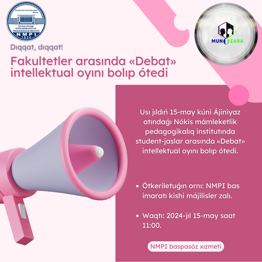 Usı jıldıń 15-may kúni Ájiniyaz atındaǵı Nókis mámleketlik pedagogikalıq institutında erkin pikirleytuǵın, óziniń turmıslıq poziciyasına iye bolǵan, turmısımızdaǵı jámiyetlik-siyasiy, social-ekonomikalıq waqıyalardı sistemalı túrde analizlep, logikalıq pikirleytuǵın, sheber túrde debat alıp baratuǵın jaslardı anıqlaw hám xoshametlew maqsetinde student-jaslar arasında «Debat» intellektual oyınınıń institut basqıshı bolıp ótedi.