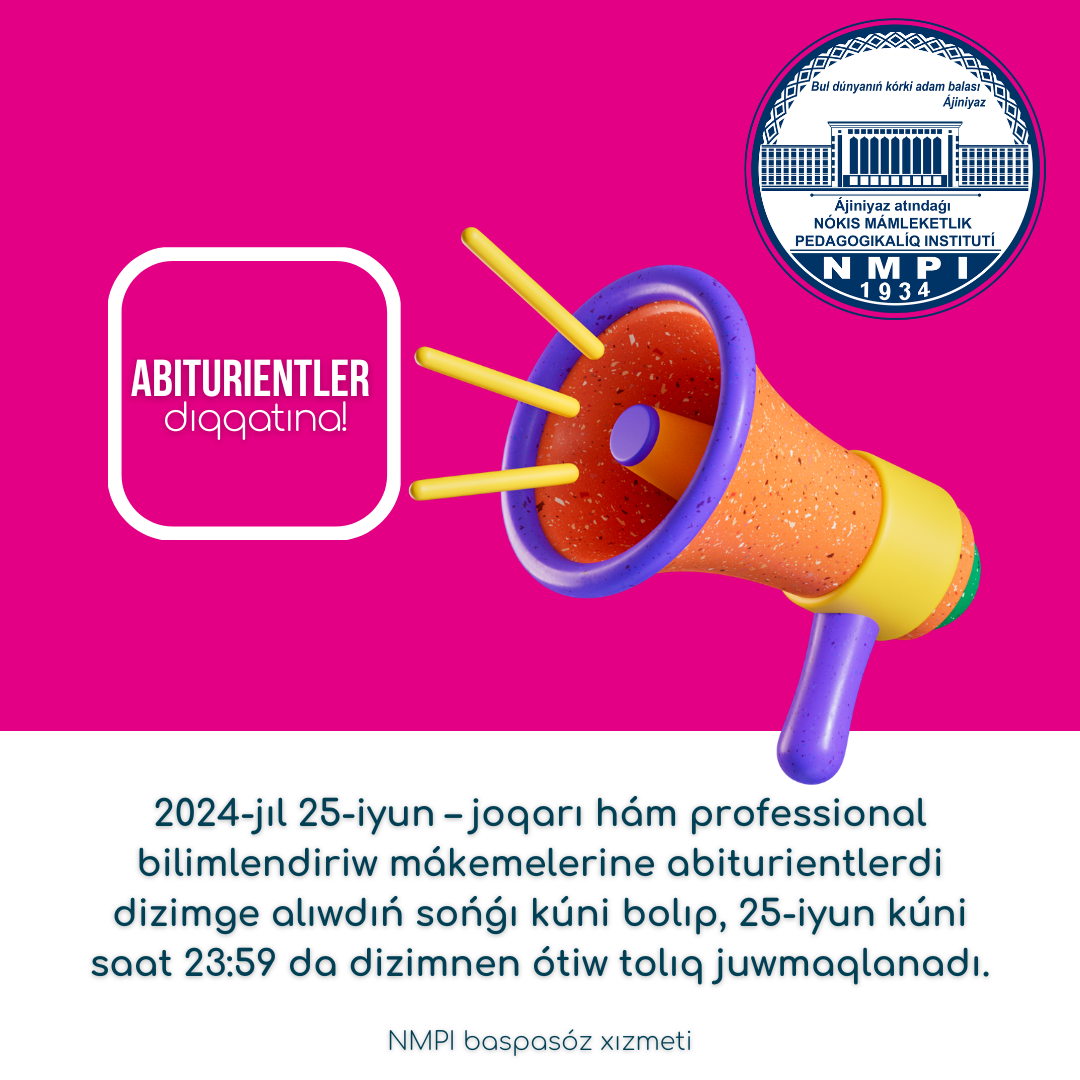 2024-jıl 25-iyun – joqarı hám professional bilimlendiriw mákemelerine abiturientlerdi dizimge alıwdıń sońǵı kúni bolıp, 25-iyun kúni saat 23:59 da dizimnen ótiw tolıq juwmaqlanadı.