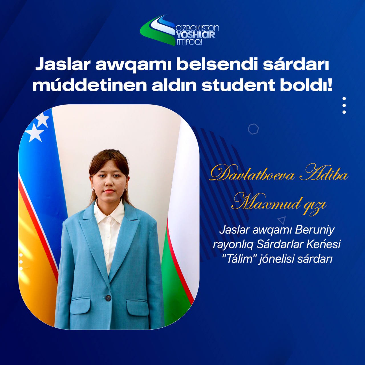 Ózbekstan jaslar awqamı Beruniy rayonlıq Sárdarlar Keńesi «Bilimlendiriw» baǵdarınıń sárdarı wazıypasında ayrıqsha belsendilik penen jumıs alıp barǵan Davlatboeva Adiba Maxmud qızı Ózbekstan Respublikası Ministrler Kabinetiniń 914-sanlı qararı tiykarında Ózbekstan jaslar awqamı respublikalıq kommissiyasınıń usınısı menen joqarı oqıw ornına jeńillik tiykarında studentlikke usınıs etildi.
