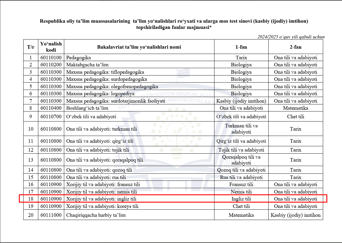«Respublikalıq joqarı bilimlendiriw mákemeleriniń tálim baǵdarları dizimi hám olarǵa sáykes test sınaqları (kásiplik (dóretiwshilik) imtixan) tapsırılatuǵın pánler kompleksi»nde kórsetip ótiliwinshe, 2024-2025-oqıw jılı qabıllawında «60110900 – Shet tili hám ádebiyatı: inglis tili» bakalavriat tálim baǵdarına kiriw imtixanları test formasında ótkeriledi.