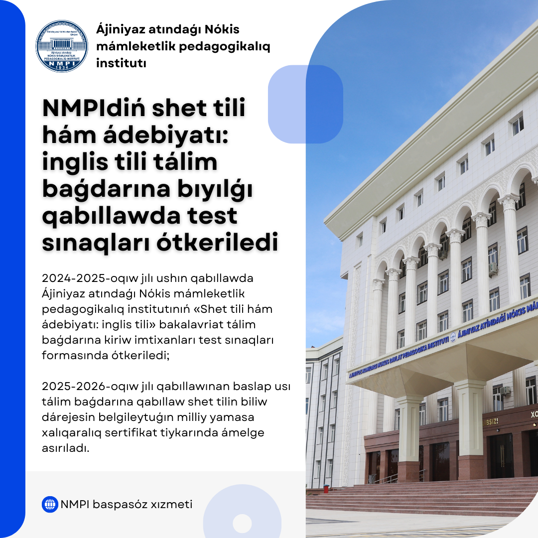 Xabarıńız bar, Ózbekstan Respublikası Ministrler Kabinetiniń 2022-jıl 19-yanvardaǵı «Shet tillerin úyreniwdi jetilistiriw boyınsha qosımsha ilajlar haqqında»ǵı 34-sanlı qararına muwapıq, 2022-2023-oqıw jılı qabıllawınan baslap Ózbekstandaǵı shet tilleri boyınsha kadrlar tayarlawǵa qánigelestirilgen 8 joqarı oqıw ornı qatarında Ájiniyaz atındaǵı Nókis mámleketlik pedagogikalıq institutınıń «Shet tili hám ádebiyatı: inglis tili» bakalavriat tálim baǵdarına kiriw imtixanlarında shet tili páninen tıńlap túsiniw, oqıw, jazıw hám sóylew kompetenciyaların anıqlaw jáne bahalawǵa baǵdarlanǵan kásiplik (dóretiwshilik) imtixanı ótkerilip kiyatırǵan edi.