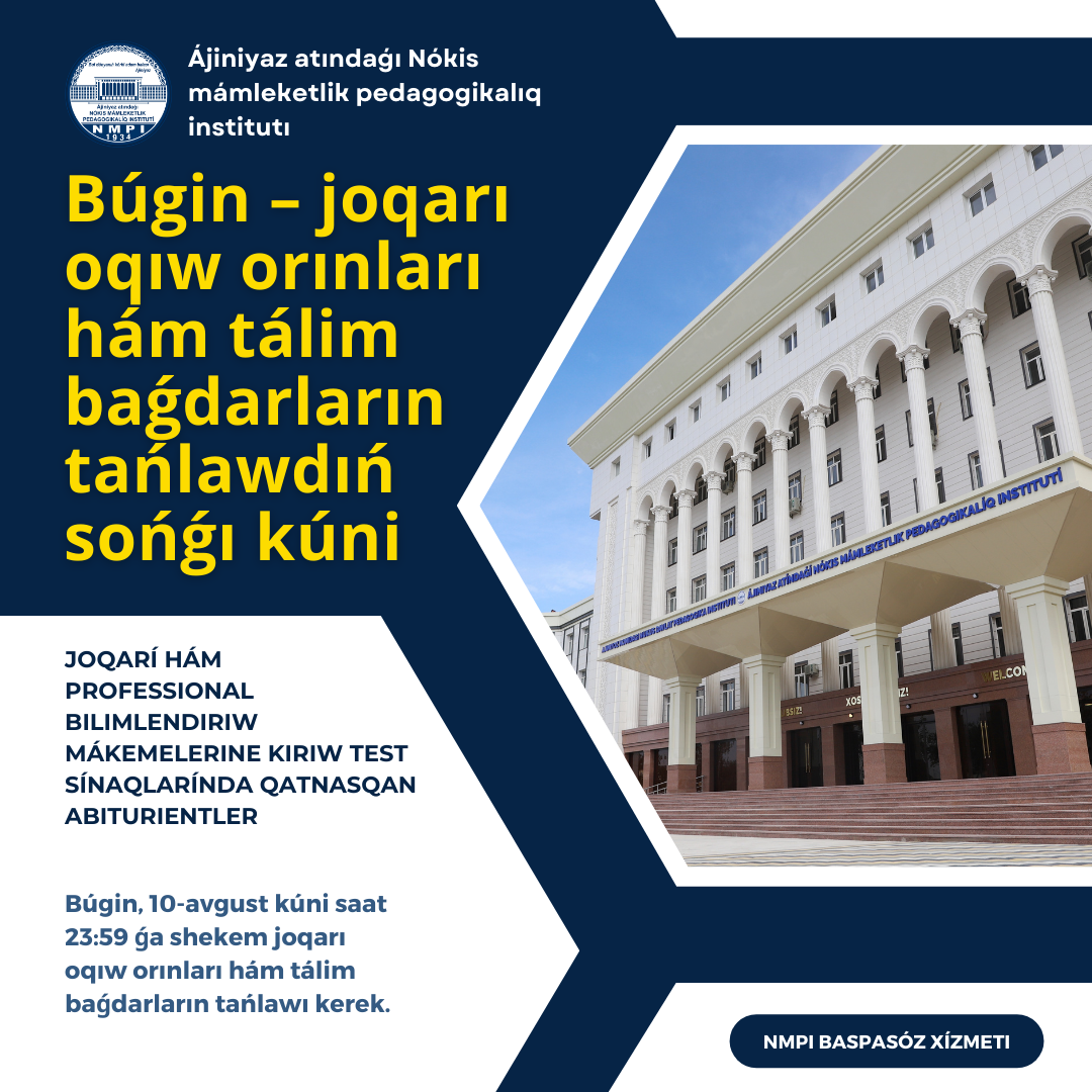 Joqarı hám professional bilimlendiriw mákemelerine kiriw test sınaqlarında qatnasqan abiturientler búgin, 10-avgust kúni saat 23:59 ǵa shekem joqarı oqıw orınları hám tálim baǵdarların tańlawı kerek.