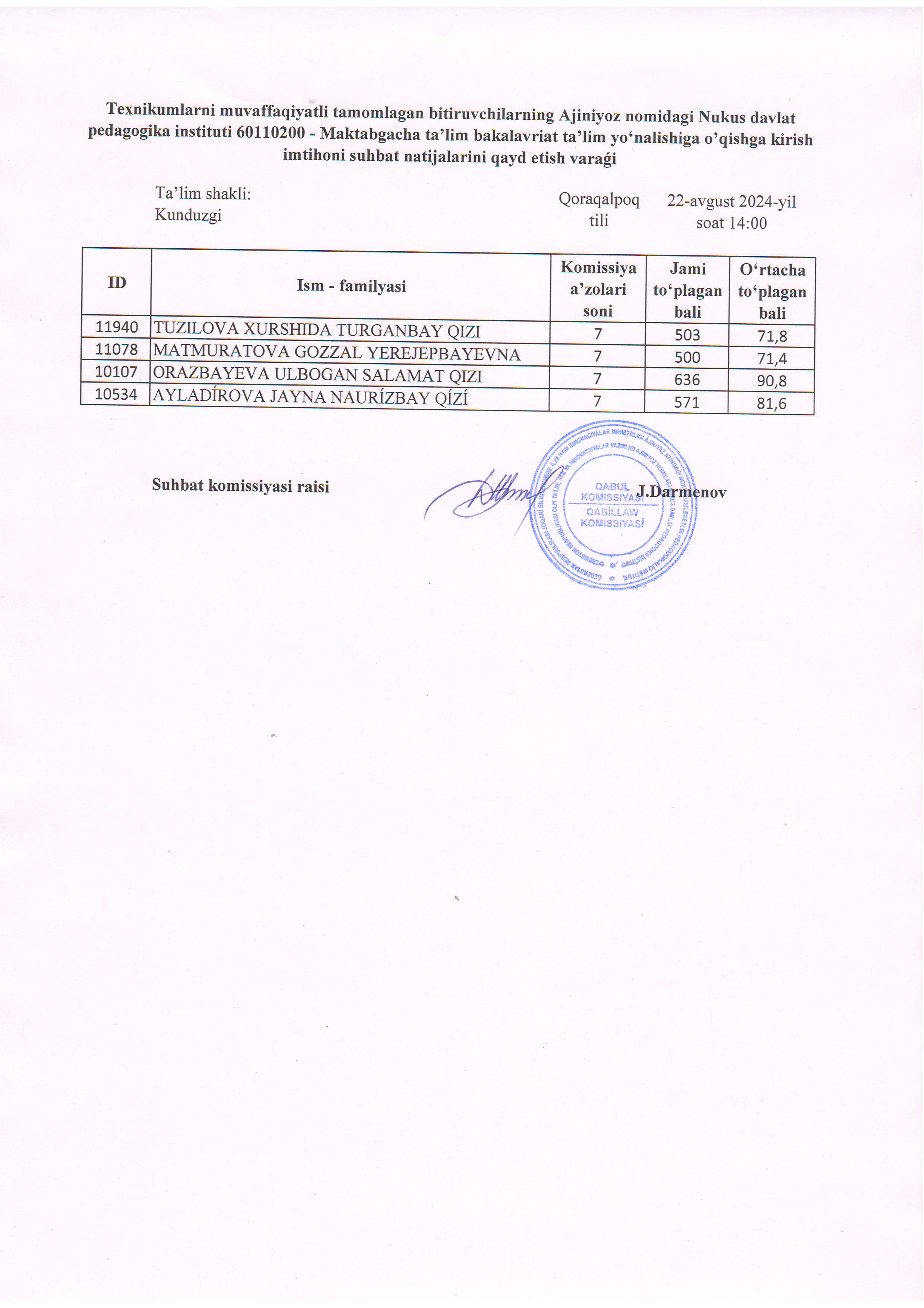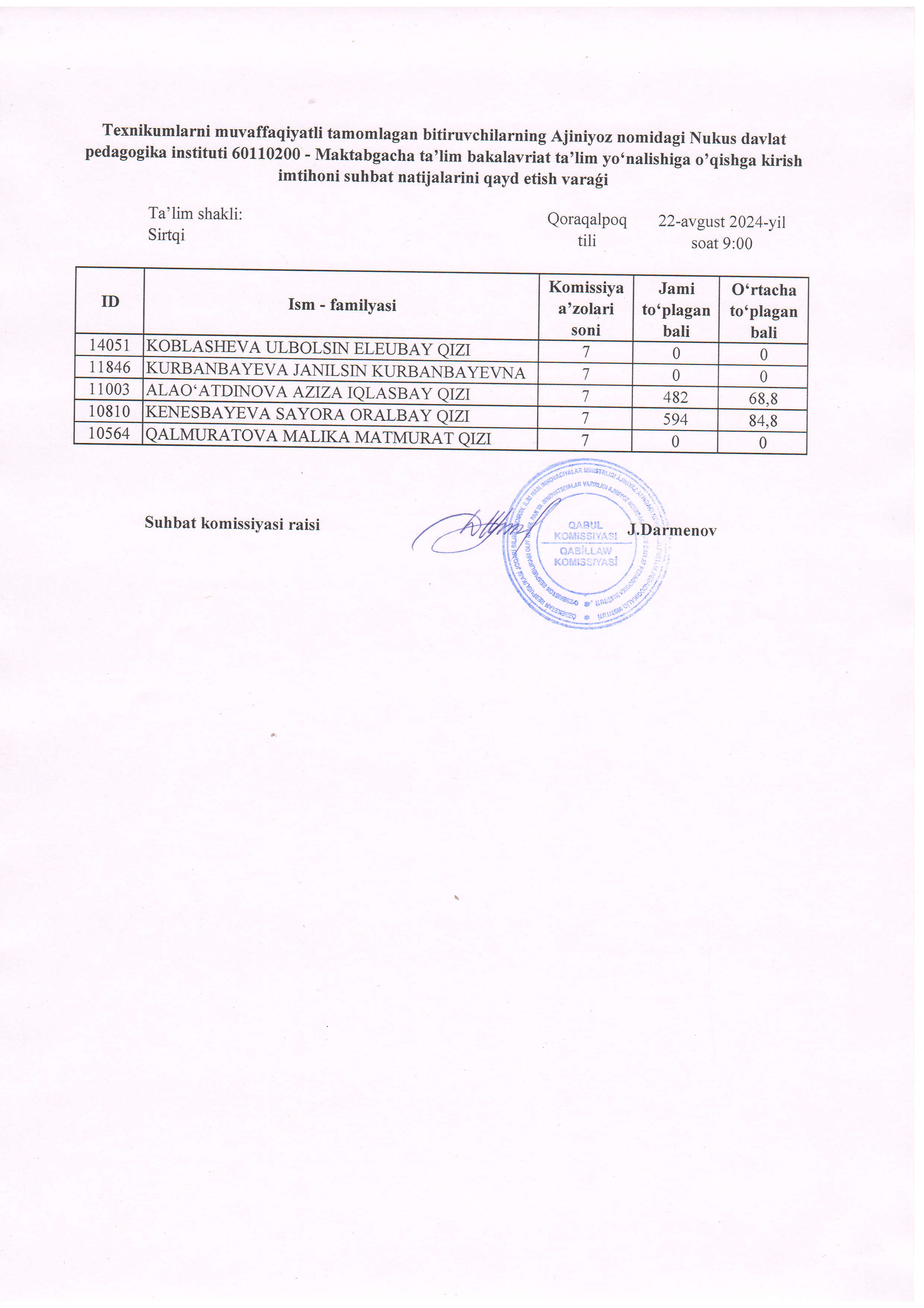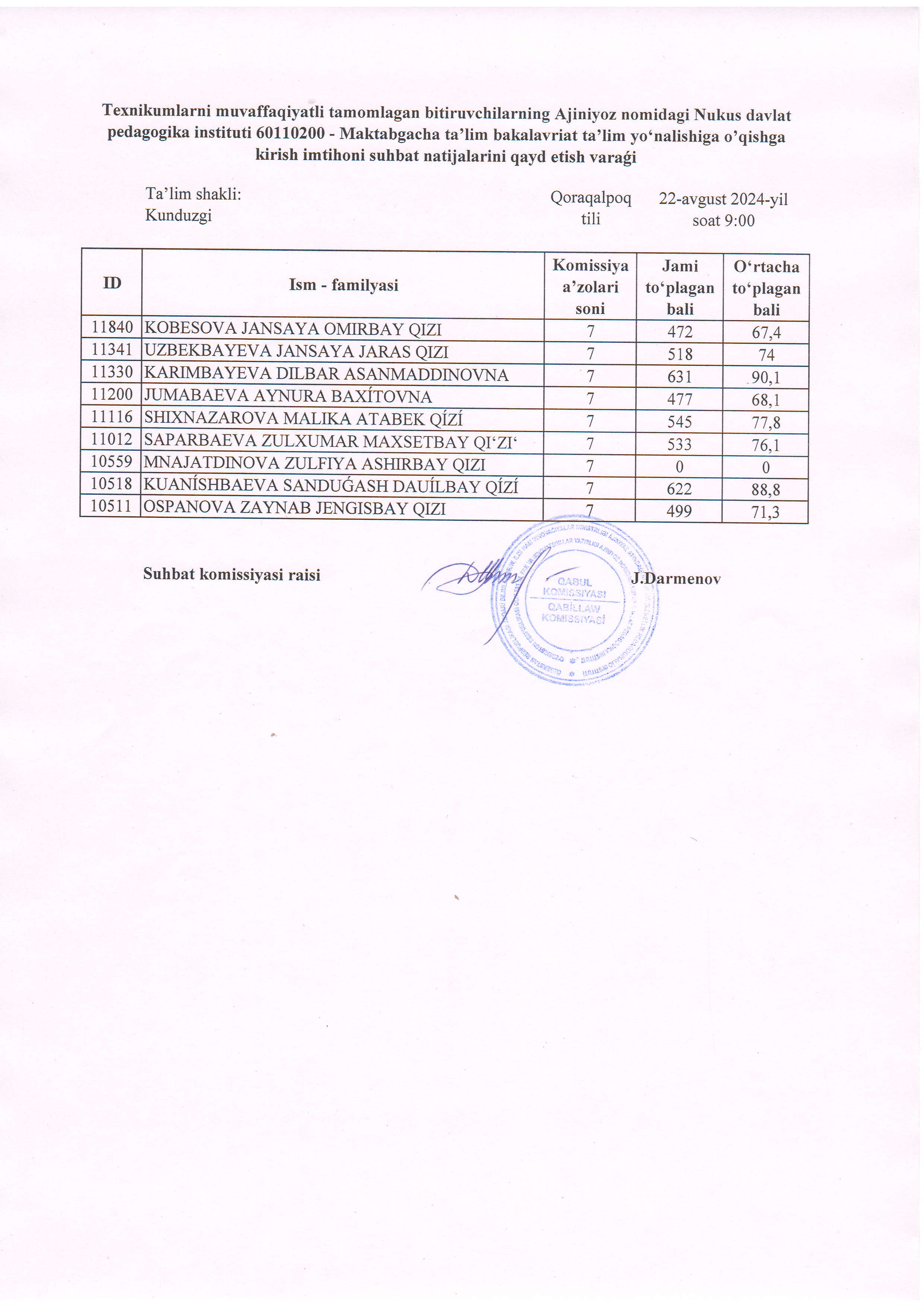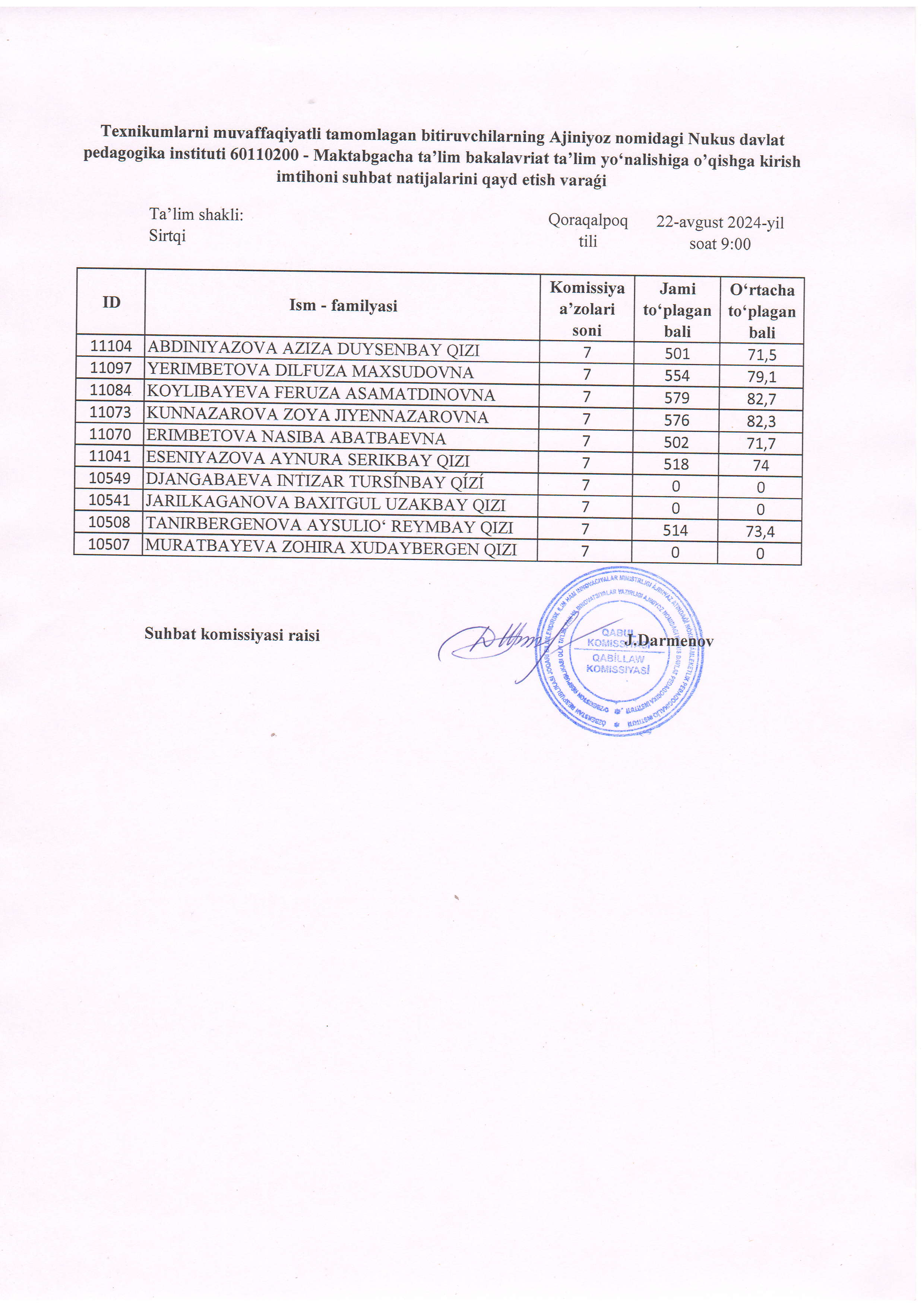 Búgin, 22-avgust kúni Ájiniyaz atındaǵı Nókis mámleketlik pedagogikalıq institutında 2024-2025-oqıw jılı ushın texnikumlardı tabıslı tamamlaǵan pitkeriwshilerdi bakalavriattıń mektepke shekemgi tálim baǵdarına oqıwǵa qabıllaw boyınsha ótkerilgen sáwbet nátiyjeleri járiyalandı.