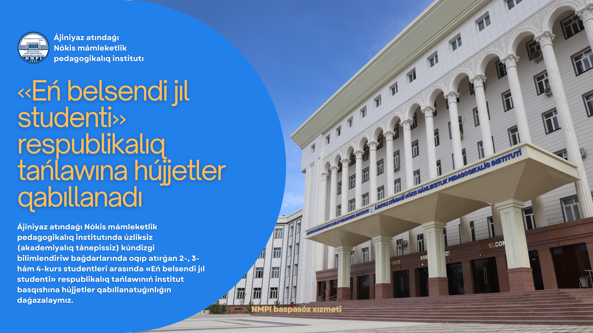 Ájiniyaz atındaǵı Nókis mámleketlik pedagogikalıq institutında úzliksiz (akademiyalıq tánepissiz) kúndizgi bilimlendiriw baǵdarlarında oqıp atırǵan 2-, 3- hám 4-kurs studentleri arasında «Eń belsendi jıl studenti» respublikalıq tańlawınıń institut basqıshına hújjetler qabıllanatuǵınlıǵın daǵazalaymız.