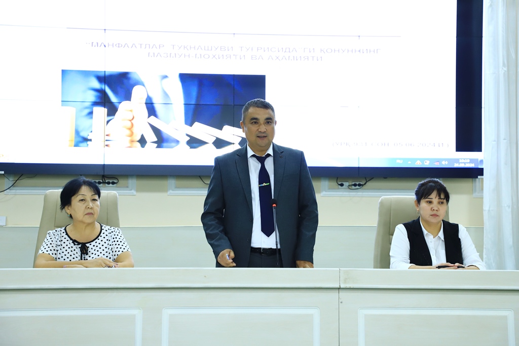 Seminarda Qaraqalpaqstan Respublikası Ádillik ministrliginiń huqıqıy málimleme sektorı baslıǵı Nuriya Berdiniyazova, instituttıń aǵa yuristkonsultı Baxtıgúl Arzievalar sózge shıǵıp, mápler soqlıǵısıwı – bul adamnıń tikkeley yamasa tikkeley bolmaǵan jeke mápi xızmet wazıypaların obyektiv hám qalıs orınlawǵa tásir etetuǵın jaǵday ekenligi, buǵan óz waqtında qarsı keskin gúres alıp barılsa, yaǵnıy mápler soqlıǵısıwına jol qoyılmasa, korrupciyanıń da júz bermeytuǵınlıǵı, barlıq tarawlarda rawajlanıwlar bolatuǵınlıǵın atap ótti.