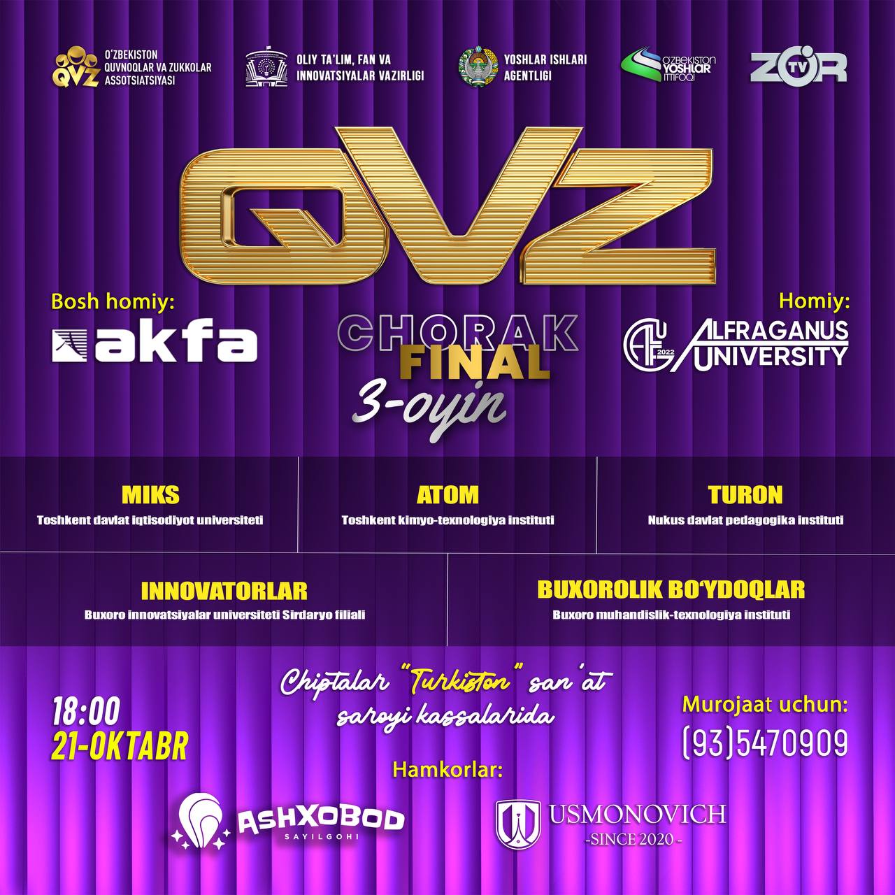 Solay etip, institutımızdıń «Turan» komandası aǵzaları usı jıldıń 21-oktyabr kúni saat 18:00 de Tashkent qalasındaǵı «Túrkstan» kórkem óner sarayında bolıp ótetuǵın sherek finaldıń 3-oyınında óz saxnalıq sheberliklerin kórsetedi.