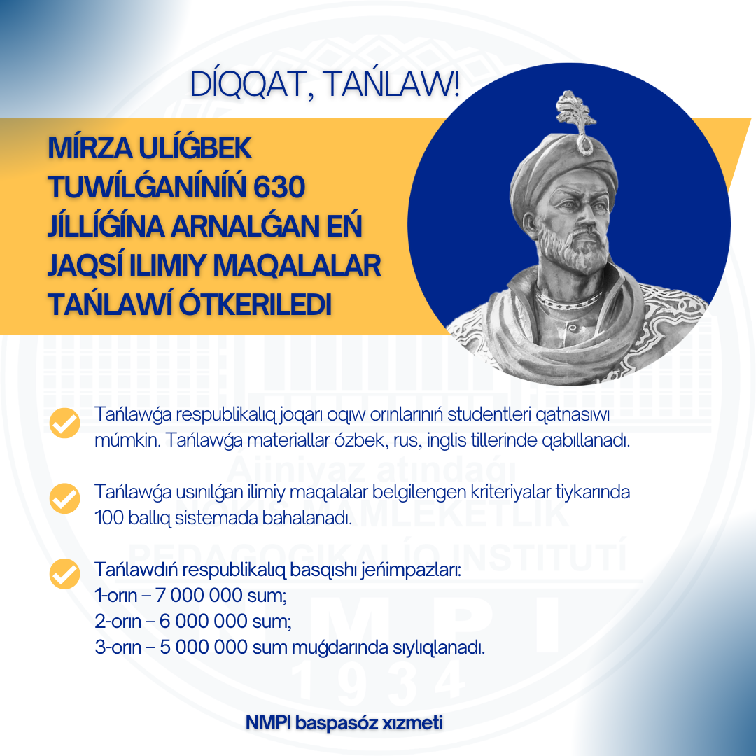 Ózbekstan Respublikası Prezidentiniń «Ullı enciklopedist alım hám belgili mámleketlik ǵayratker Mırza Ulıǵbek tuwılǵanınıń 630 jıllıǵın keń túrde belgilew haqqında»ǵı qararı tiykarında Ájiniyaz atındaǵı Nókis mámleketlik pedagogikalıq institutında «Mırza Ulıǵbektiń ómiri hám ilimiy-aǵartıwshılıq miyrasın úyreniwge arnalǵan eń jaqsı ilimiy maqalalar» tańlawı shólkemlestirilmekte.