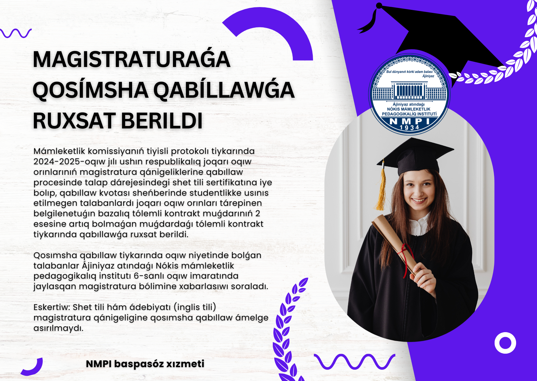 Qosımsha qabıllaw tiykarında oqıw niyetinde bolǵan talabanlar Ájiniyaz atındaǵı Nókis mámleketlik pedagogikalıq institutı 6-sanlı oqıw imaratında jaylasqan magistratura bólimine xabarlasıwı soraladı.