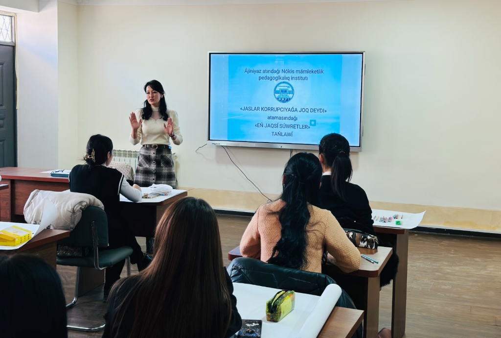 Ájiniyaz atındaǵı Nókis mámleketlik pedagogikalıq institutında jaslar arasında sociallıq-ruwxıy ortalıqtıń turaqlılıǵın támiyinlew, olardıń hár qıylı korrupciyalıq jaǵdaylarǵa aralasıp qalıwınıń aldın alıw, jas áwladtı hár tárepleme jetik, joqarı mánawiyatlı, intellektual potencialǵa iye, ata-anasına, Watanına sadıq kámil insan etip tárbiyalaw maqsetinde «Jaslar korrupciyaǵa joq deydi» atamasındaǵı «Eń jaqsı súwretler» tańlawı bolıp ótti.