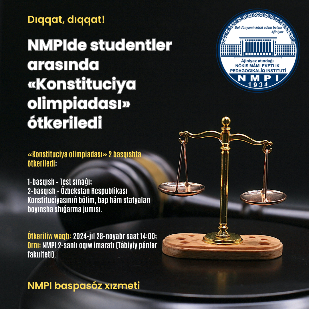 Ájiniyaz atındaǵı Nókis mámleketlik pedagogikalıq institutında student-jaslardıń Ózbekstan Respublikası Konstituciyası, onıń tiykarǵı principleri hám qaǵıydaları boyınsha bilimlerin arttırıwdı xoshametlew, ómirde ózleriniń múnásip orınların tabıwda Bas Nızamımızdıń áhmiyeti hám rolin túsinip alıwına múnásip sharayatlar jaratıw maqsetinde usı jıldıń 28-noyabr kúni «Konstituciya olimpiadası» ótkeriletuǵın járiyalaymız.