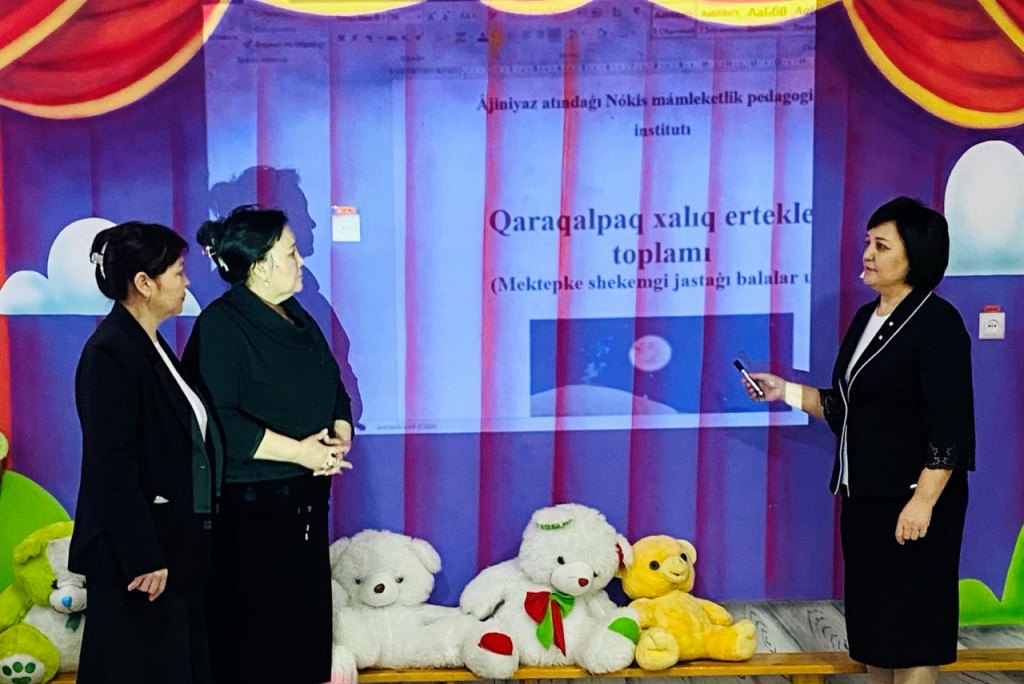 Ájiniyaz atındaǵı Nókis mámleketlik pedagogikalıq institutı Mektepke shekemgi tálim fakulteti mektepke shekemgi tárbiya hám defektologiya kafedrasınıń baslıǵı, pedagogika ilimleriniń kandidatı, docent Aynagúl Bekimbetovanıń ilimiy basshılıǵında «Mektepke shekemgi bilimlendiriw shólkemlerinde 3-7 jastaǵı balalar ushın qaraqalpaq xalıq ertekleri hám balalar qosıqları tiykarında multimedialı texnologiyalar jaratıw hám paydalanıw (Qaraqalpaqstan Respublikası MSHBSH mısalında)» atamasındaǵı ámeliy-ilimiy joybarı sheńberinde Moynaq rayonındaǵı 4-sanlı, Nókis rayonındaǵı 3-sanlı mektepke shekemgi bilimlendiriw shólkemlerinde usı rayonlardaǵı barlıq balalar baqshalarınıń metodistleri hám tárbiyashıları ushın seminar-treningler shólkemlestirildi.