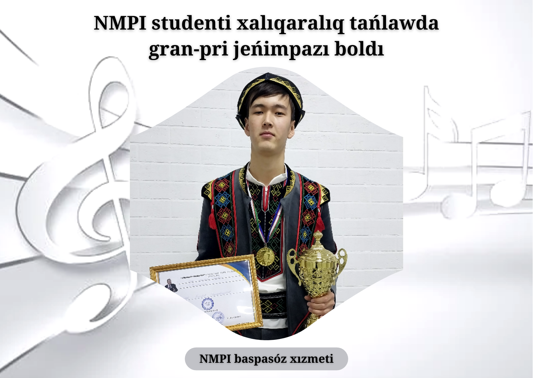 Quwanıshlısı, usı xalıqaralıq tańlawda baqsıshılıq baǵdarı boyınsha qatnasqan Ájiniyaz atındaǵı Nókis mámleketlik pedagogikalıq institutı Pedagogika fakulteti muzıkalıq tálim baǵdarınıń 1-kurs studenti Erpolat Sharipov gran-pri jeńimpazı boldı.