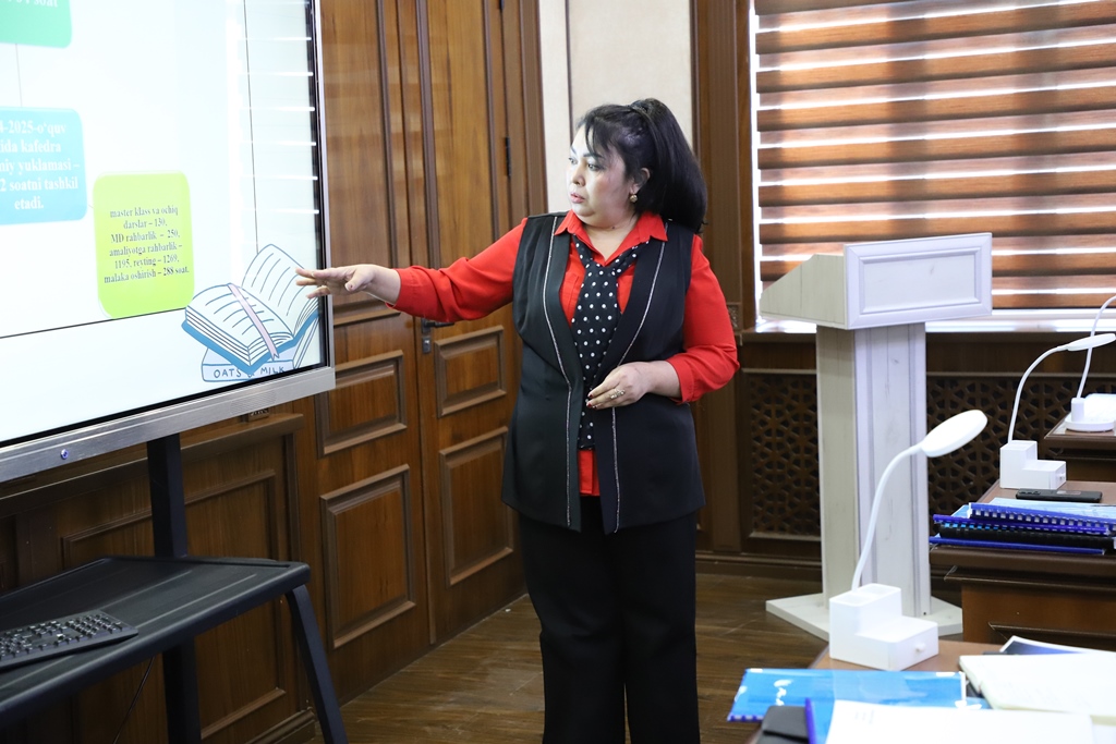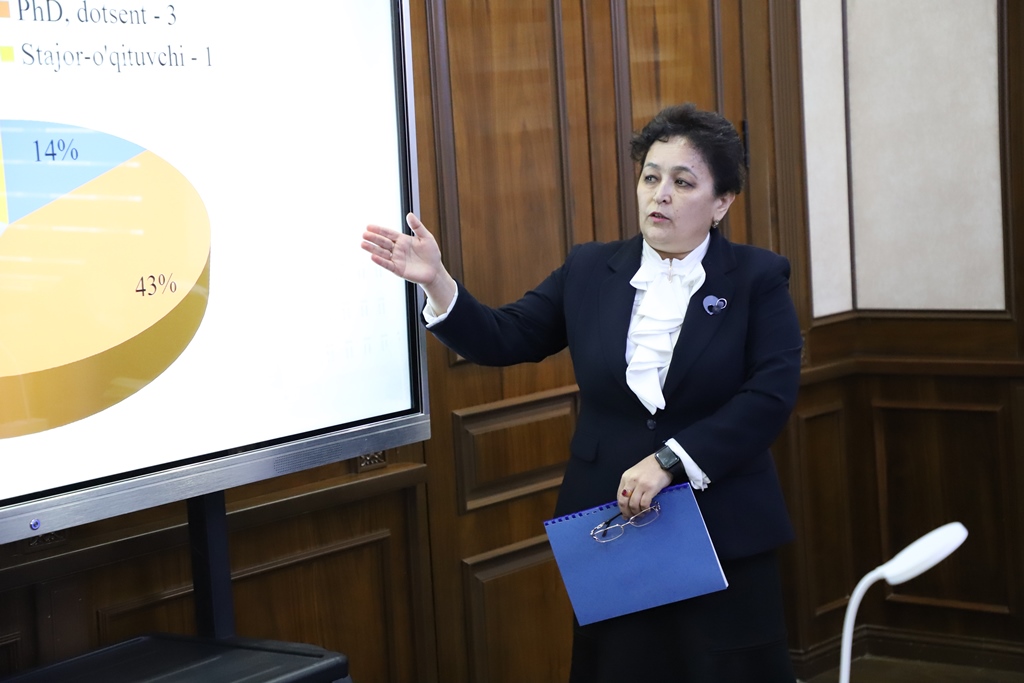 Institut rektorı Q.Qodirov, barlıq prorektorlar, bilimlendiriw sapasın qadaǵalaw bóliminiń wákilleri hám fakultettiń pedagogikalıq jámááti qatnasıwında bolıp ótken ilajda kafedra baslıqları hám fakultet dekanı bilimlendiriw procesiniń sapası hám nátiyjeliligin arttırıw, ilimiy-izertlew hám innovaciyalıq jumıslardı rawajlandırıw, xalıqaralıq birge islesiw, ruwxıy-aǵartıwshılıq hám tárbiyalıq jumıslardı sistemalı jetilistiriw, instituttıń 2025-jıldaǵı jumısları boyınsha milliy reytingdi rawajlandırıwǵa baǵdarlanǵan ilajlardı ámelge asırıwda fakultetlerdiń úlesi boyınsha prezentaciya kórinisinde maǵlıwmatlar berdi.